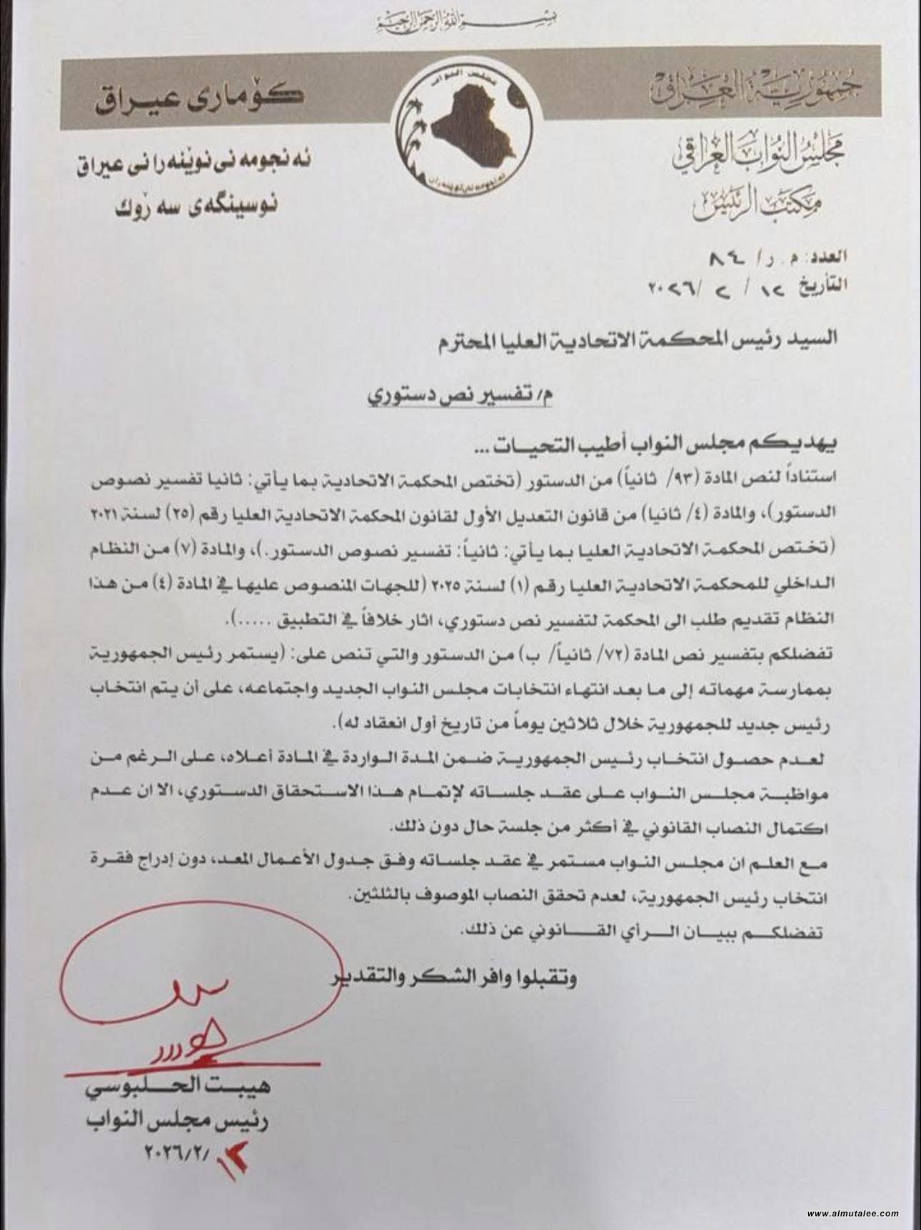 بالوثيقة... رئيس البرلمان يستفتي الإتحادية بشأن حسم ملف رئيس الجمهورية
