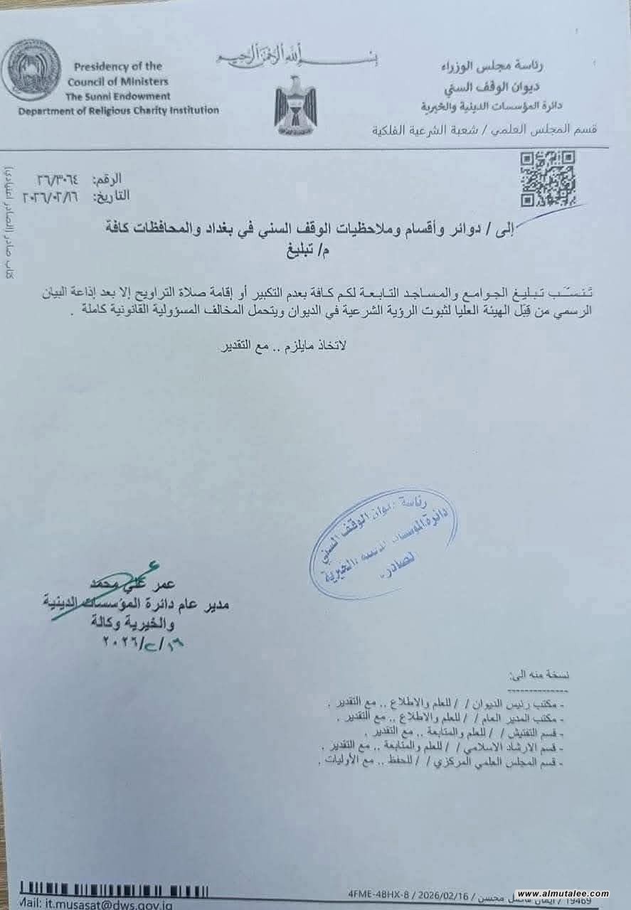 أصدر ديوان الوقف السني، اليوم الاثنين، تعميماً عاجلاً إلى جميع فروعه في محافظات العراق، يقضي بمنع إقامة أو إذاعة صلاة التراويح في المساجد إلا بعد الحصول على الإذن الرسمي من الجهات المختصة بالديوان وهيئة ثبوت الرؤية الشرعية.