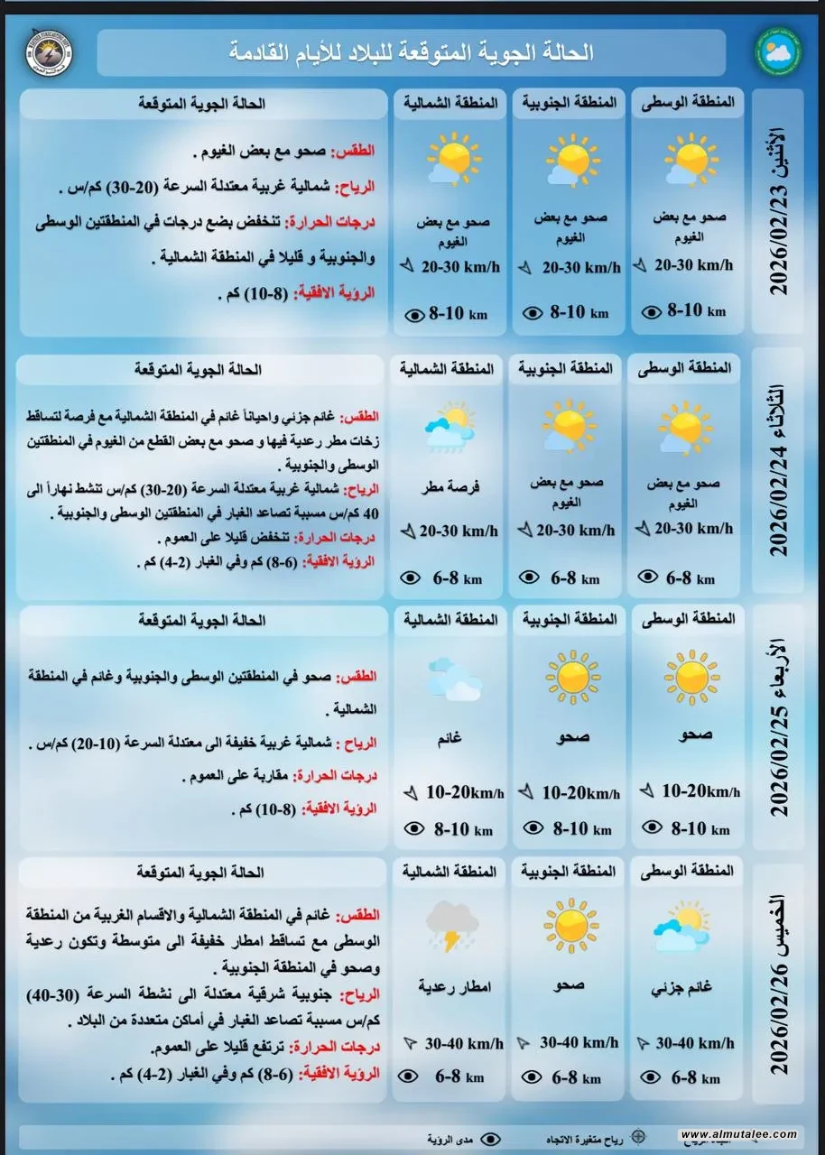 وفيما يلي بيانات هيئة الأنواء التي تلقتها المطلع: