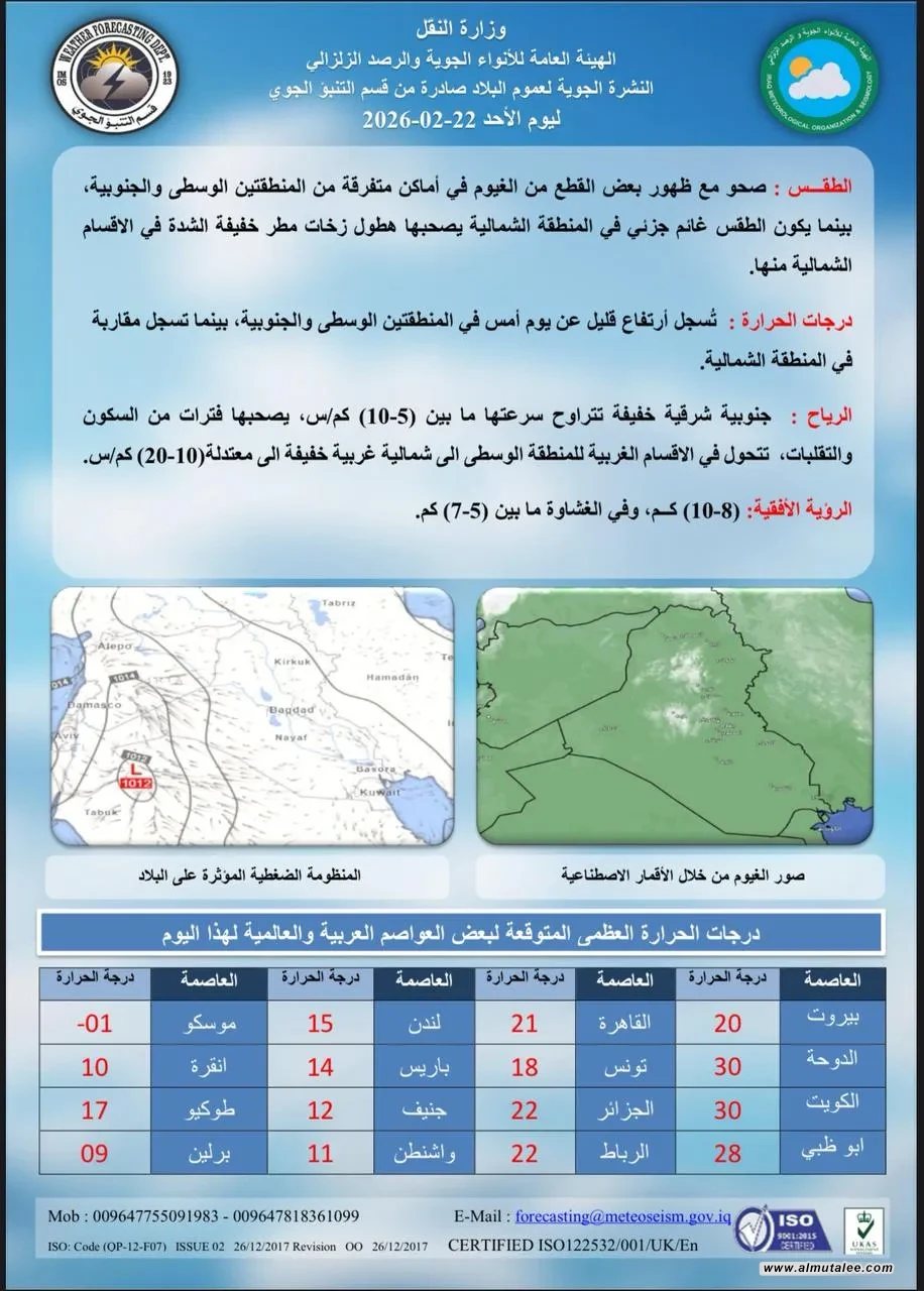أعلنت هيئة الأنواء الجوية، اليوم الأحد، حالة طقس العراق خلال الأيام المقبلة، مشيرة إلى احتمالات هطول أمطار وغبار وانخفاض بدرجات الحرارة.