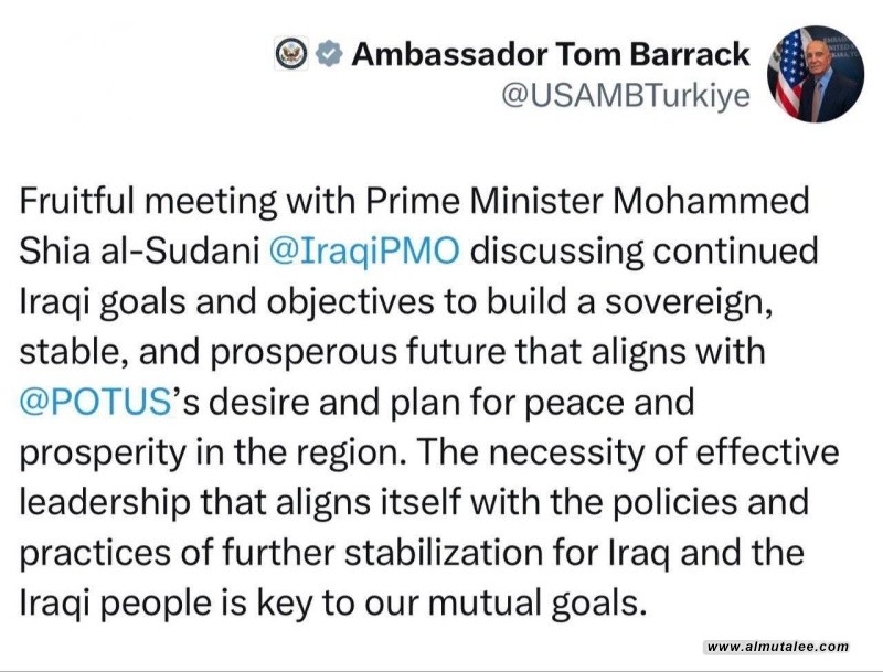 وأمس الأحد أعلن، المكتب الاعلامي للسوداني، أن: "الاخير استقبل المبعوث الأمريكي الخاص الى سوريا توم باراك، حيث جرى خلال اللقاء بحث العلاقات الثنائية بين العراق والولايات المتحدة، والأوضاع العامة في المنطقة، وما يبذله العراق لدعم الاستقرار الإقليمي، واستقرار سوريا على وجه الخصوص".