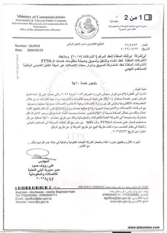 وذكرت وثيقة صادرة عن مديرية البنى التحتية للاتصالات والمعلوماتية، موجهة إلى شركة إيرثلنك والشركات المنفذة لعقود (FTTH) والخدمات الضوئية، تلقتها "المطلع"، أنه:"إشارة إلى الفقرة (5) من قرار مجلس الوزراء المرقم 1083 لسنة 2025، والتي نصت على إعادة العمل بفرض أجور خدمة بمقدار 20% على تعبئة الرصيد للتلفونات والإنترنت، سواء منها الكارتات أم من خلال التطبيقات الإلكترونية".