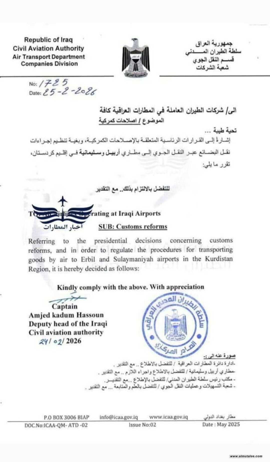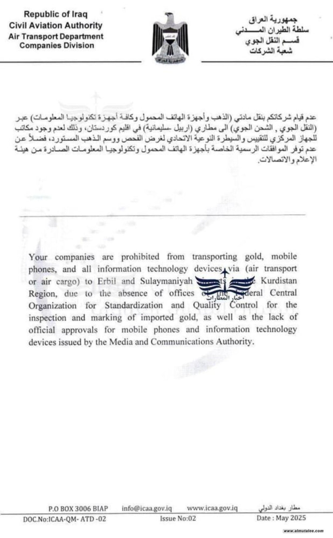 وجهت سلطة الطيران، اليوم الأربعاء، شركات الطيران العاملة في المطارات العراقية بإيقاف إدخال الذهب وأجهزة الهاتف المحمول وكافة أجهزة التكنولوجيا والمعلومات عبر النقل والشحن الجوي إلى مطاري أربيل والسليمانية، وقالت إن السبب هو عدم توفر جهاز التقييس والسيطرة النوعية لفحص ووسم الذهب المستورد، وغياب الموافقة الرسمية الخاصة بالهواتف المحمولة وأجهزة التكنولوجيا والمعلومات الصادرة من هيئة الإعلام والاتصالات، وذلك في مساع العراق لتطبيق الإجراءات الدولية للتجارة، وضمن الإصلاحات الكمركية.