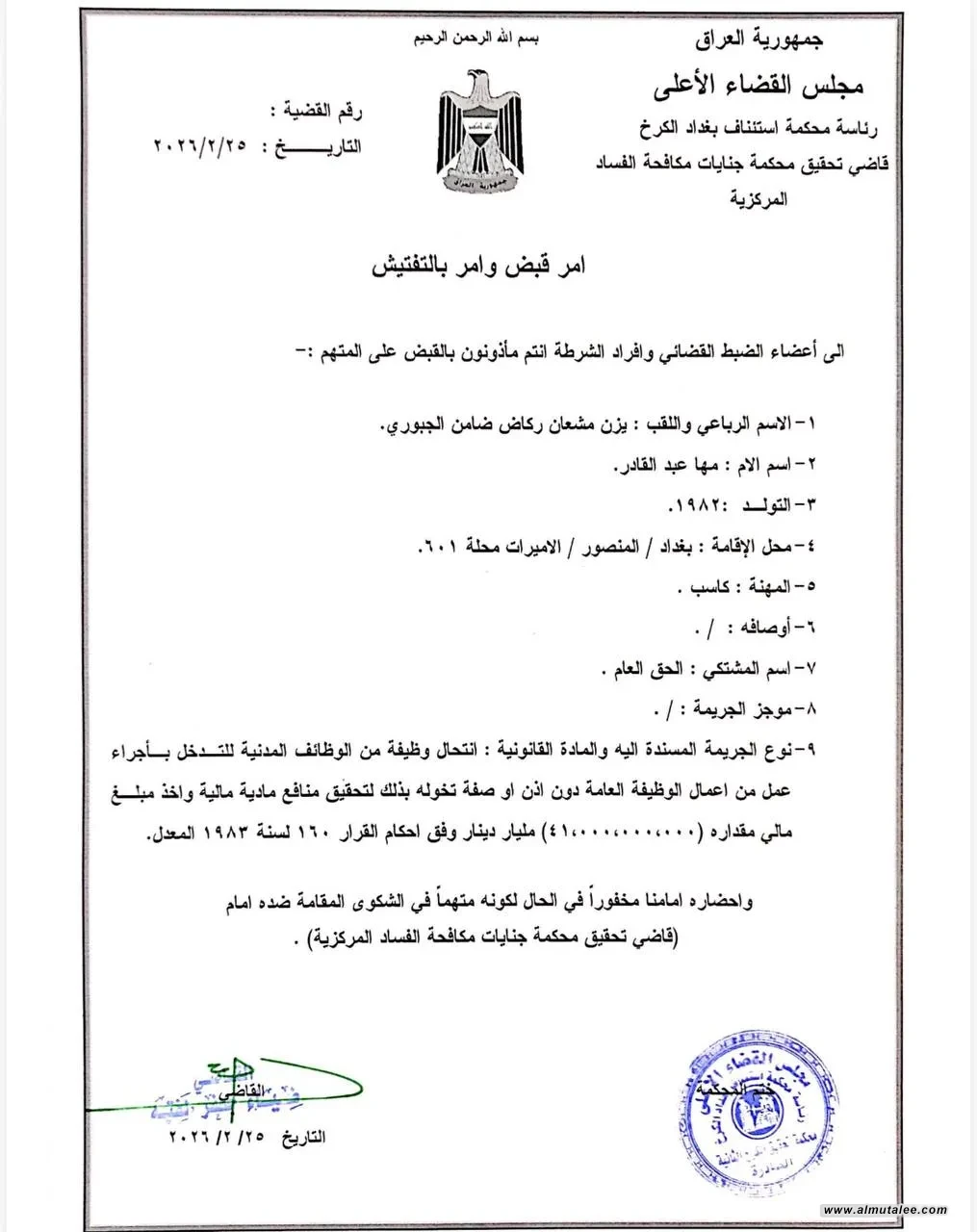 كشفت وثيقة حصلت عليها المطلع، اليوم الخميس، عن صدور أمر قبض بحق يزن مشعان الجبوري بتهمة انتحال صفة وظيفية.