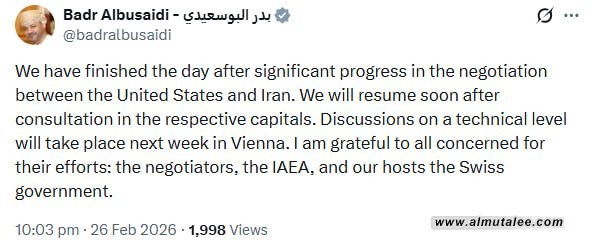 اعلن وزير الخارجية العماني، بدر بن حمد البوسعيدي، اليوم الخميس، عن انتهاء مفاوضات اليوم بعد إحراز تقدم ملحوظ بين إيران والولايات المتحدة، وفيما كشف عن مناقشات فنية ستعقد الأسبوع المقبل في فيينا، بعد تشاور الوفدين مع مسؤولي البلدين.
