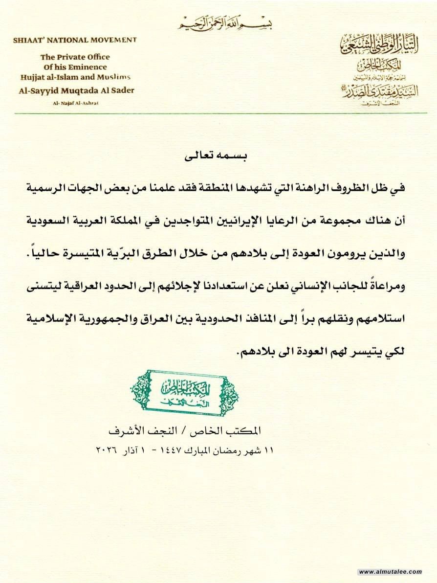 أعلن المكتب الخاص لرئيس التيار الوطني الشيعي مقتدى الصدر، اليوم الأحد، عن استعداده لاستلام مجموعة من الرعايا الإيرانيين المتواجدين في المملكة العربية السعودية ليتسنى نقلهم إلى الجمهورية الإسلامية.