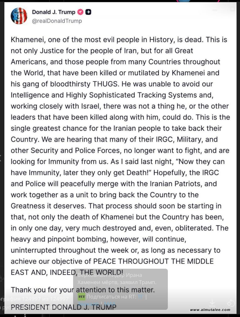 ينبغي أن تبدأ هذه العملية قريبًا، إذ لم يقتصر الأمر على وفاة خامنئي فحسب، بل دُمِّرت البلاد تدميرًا شاملًا، بل وكادت تُباد، في يوم واحد فقط. ومع ذلك، سيستمر القصف المكثف والدقيق دون انقطاع طوال الأسبوع، أو طالما كان ذلك ضروريًا لتحقيق هدفنا المتمثل في إحلال السلام في جميع أنحاء الشرق الأوسط، بل وفي العالم أجمع!.