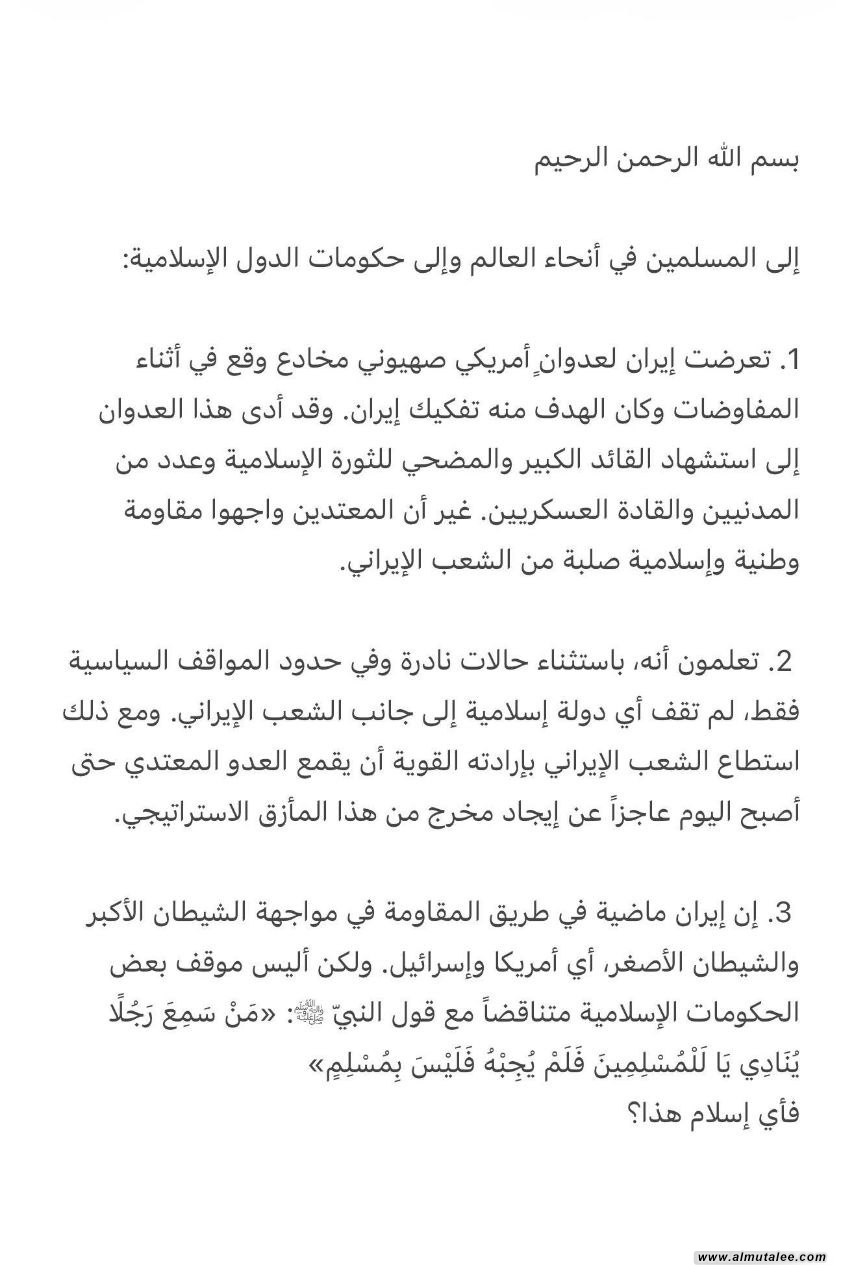 وأضاف، أن إيران ماضية في طريق المقاومة ومواجهة أمريكا وإسرائيل، متسائلاً عن تناقض مواقف بعض الحكومات الإسلامية التي اعتبرت إيران "عدواً" لأنها استهدفت قواعد ومصالح أمريكية وإسرائيلية استُخدمت للاعتداء عليها من أراضي تلك الدول، معتبراً أنه لا يمكن الطلب من إيران الوقوف مكتوفة الأيدي تجاه تلك الاعتداءات.