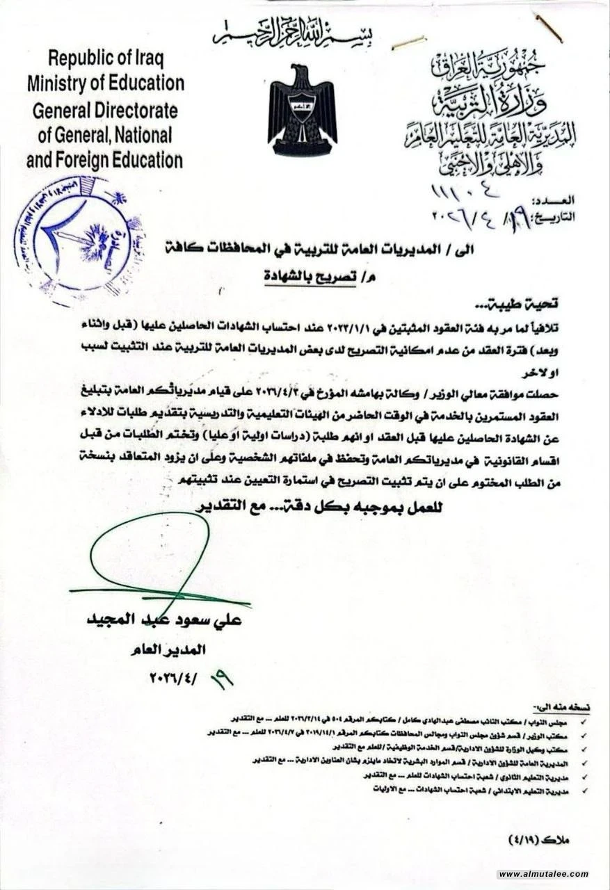 أصدر وزير التربية وكالة أحمد الأسدي، اليوم الأحد، قراراً يقضي بالسماح للمتعاقدين بالتصريح بالشهادات الدراسية (الأولية والعليا) التي حصلوا عليها قبل وأثناء مدة العقد.