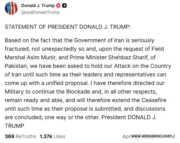 وذكر ترامب في تدوينة له على حسابه بمنصة "تروث"، أنه: "بناءً على حقيقة معاناة الحكومة الإيرانية من انقسام حاد، وبناءً على طلب كلٍ من المشير عاصم منير ورئيس الوزراء شهباز شريف من باكستان، فقد طُلب تعليق الهجوم على إيران إلى حين تمكّن قادتها وممثليها من التوصل إلى مقترح موحد".