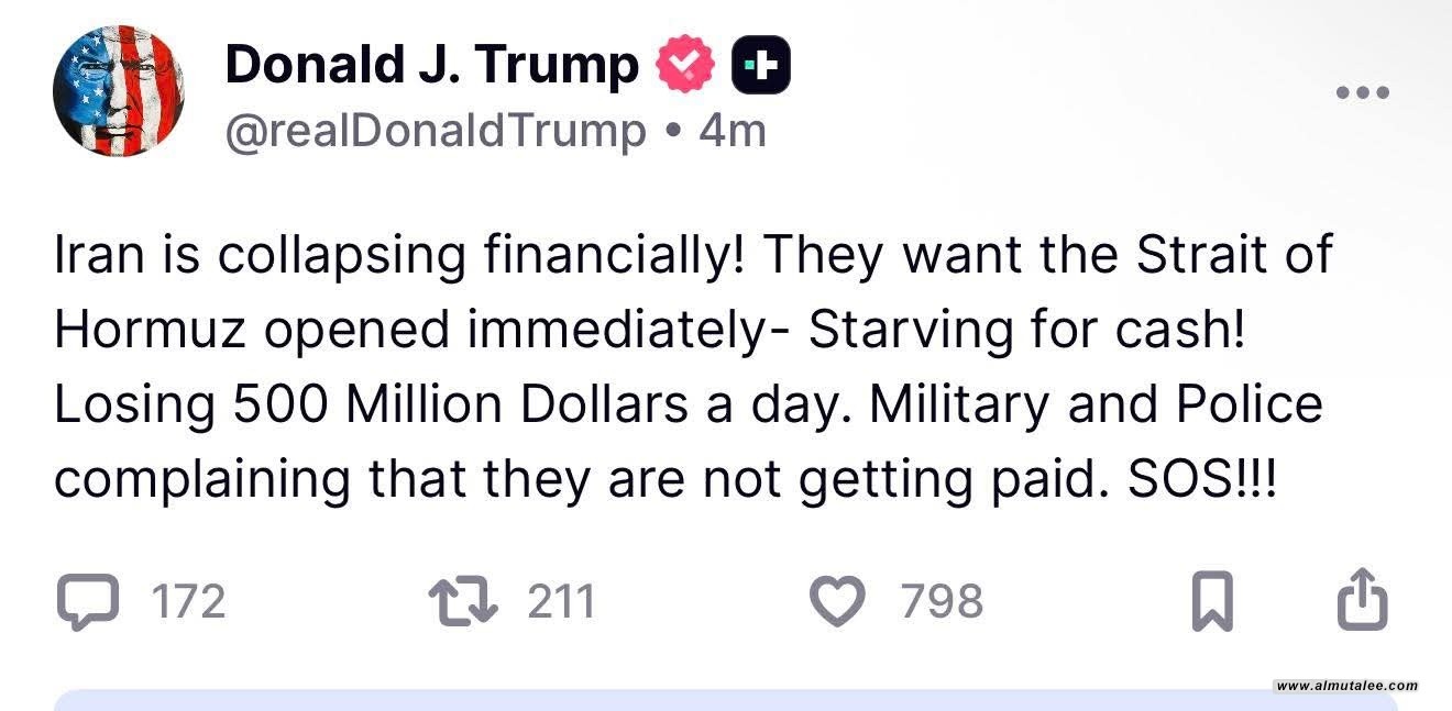 وذكر ترامب، في منشور على "تروث سوشيال"، أن "إيران تنهار اقتصاديًا"، مضيفًا أنها "تريد فتح مضيق هرمز فورًا".