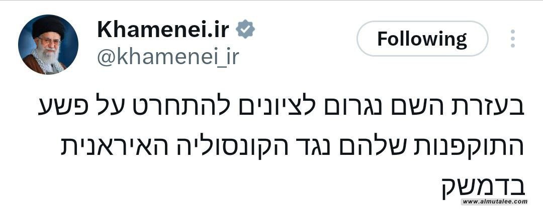 عەلی خامنەیی، ڕێبەری ئیسلامی ئێران لەبارەی بەئامانجکردنی کونسوڵخانەی وڵاتەکەی لە دیمەشق لێدوانی دا و جەختی لەوە کردەوە کە "ئیسرائیل سزا دەدرێت، ئێمەش وایان لێدەکەین پەشیمان بن لەم تاوانە و سەرجەم تاوانەکانی دیکەی". خامنەیی پێشتر وتی: ژەنەڕاڵ محەمەد ڕەزا زاهیدی و ژەنەڕاڵ محەمەد هادی حاج ڕەحیمی لە تاوانێک کە لە لایەن قەوارەی ڕقاوی قۆرخکاری زایۆنیستیەوە ئەنجام درا، شەهید بوون و دەشڵێت: ژەنەڕاڵ زاهیدی لە چاوەڕوانی شەهیدبووندا بوو لە مەیدانی مەترسی و جیهاد لە هەشتاکانی سەدەی ڕابردووەوە، هیچی لەدەست نەدا، بەڵکو پاداشتی بەدەست هێنا”، بەڵام لەدەستدانی بۆ گەلی ئێران زۆر گەورەیە، بە تایبەت بۆ ئەوانەی دەیانناسی.” جەختیشی کردەوە، "ئەو قەوارە زیانبەخشە لەسەر دەستی پیاوە قارەمانەکانمان سزا دەدرێن. وایان لێدەکەین پەشیمان بن لەم تاوانە و سەرجەم تاوانەکانی دیکە".