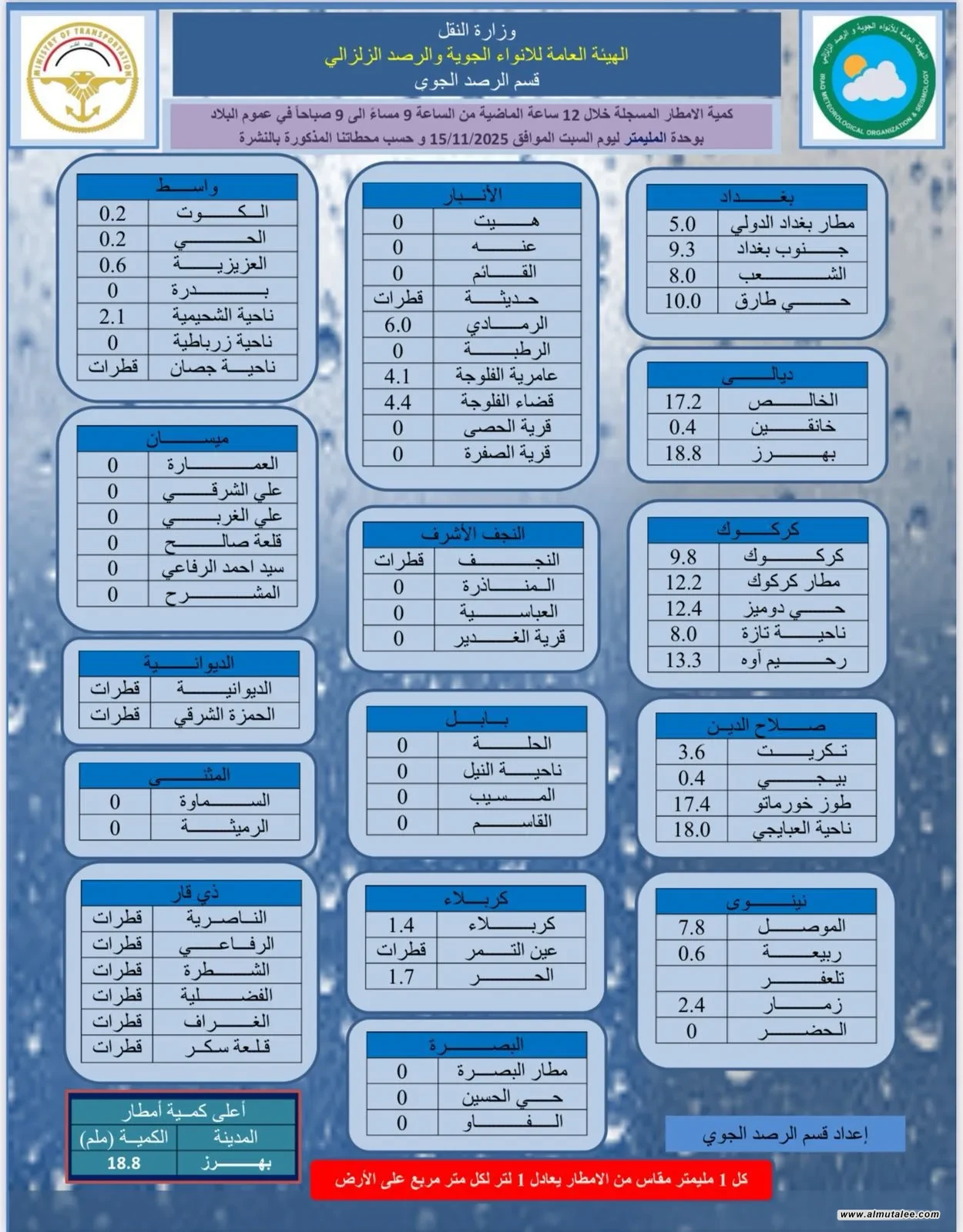 أعلنت الهيئة العامة للأنواء الجوية والرصد الزلزالي، اليوم السبت، كميات الأمطار المسجّلة خلال الساعات الـ12 الماضية، من الساعة التاسعة مساءً حتى التاسعة صباحاً، في عموم البلاد.