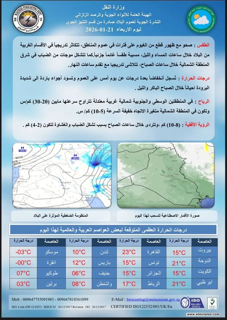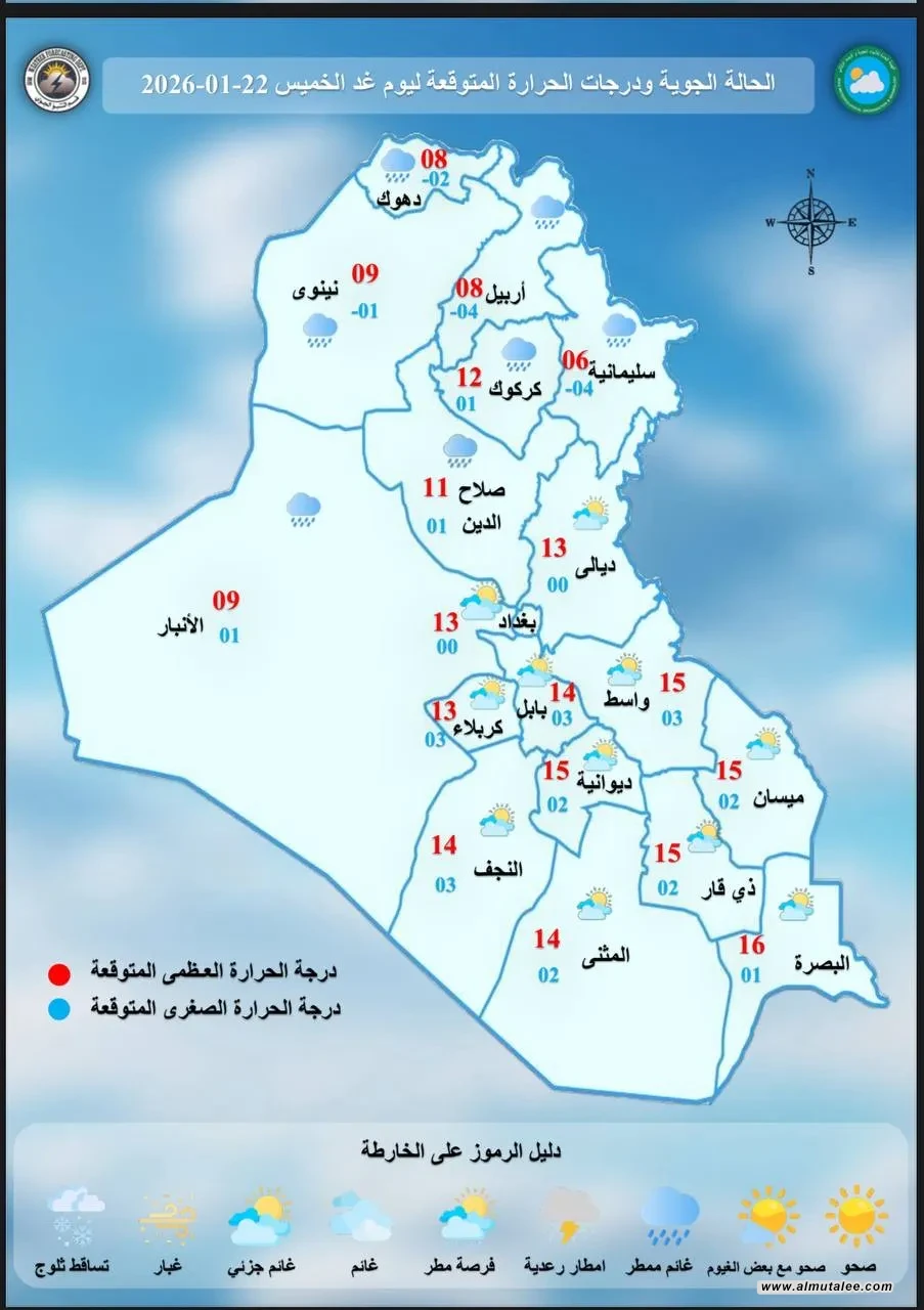 تشير خرائط الطقس، اليوم الأربعاء، إلى أجواء غائمة في أغلب مناطق العراق، مع فرص لتساقط أمطار خفيفة في المنطقتين الوسطى والشمالية خلال الأيام المقبلة.