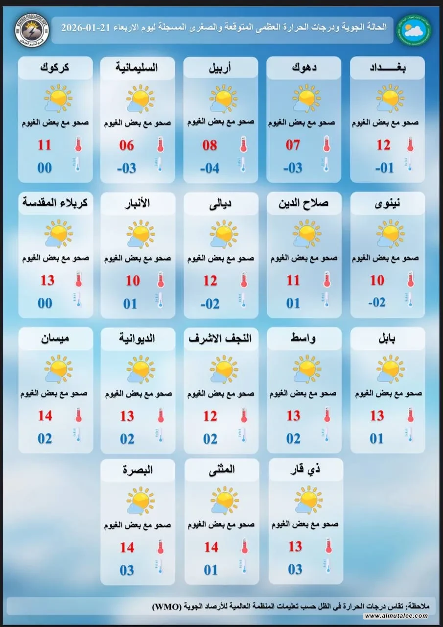 وتابعت، أن "طقس اليوم سيكون صحوًا مع ظهور قطع من الغيوم على فترات في عموم المناطق، تتكاثر تدريجيًا في الأقسام الغربية من البلاد خلال ساعات المساء والليل، مسببة طقسًا غائمًا جزئيًا، فيما ستسجل درجات الحرارة انخفاضًا بعدة درجات عن يوم أمس على العموم، وتسود أجواء باردة إلى شديدة البرودة أحيانًا خلال الصباح الباكر والليل".