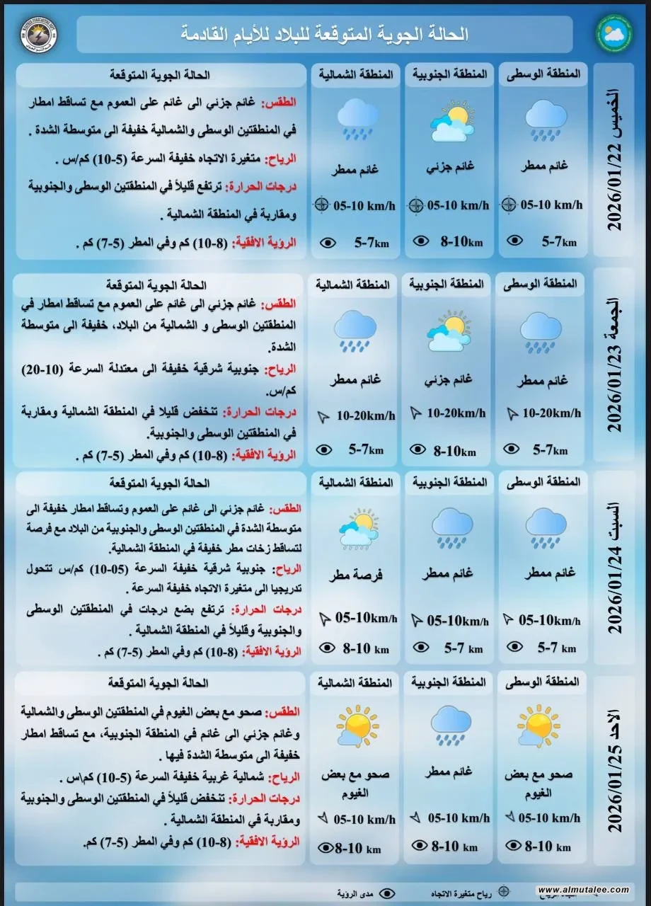 وبحسب الخرائط الرسمية، فإن درجات الحرارة ستسجل انخفاضًا بعدة درجات، وتسود أجواء باردة إلى شديدة البرودة أحيانًا خلال الصباح الباكر والليل، كما تتشكل موجات من الضباب في شرق المنطقة الشمالية خلال ساعات الصباح، تتلاشى تدريجيًا مع تقدم ساعات النهار.