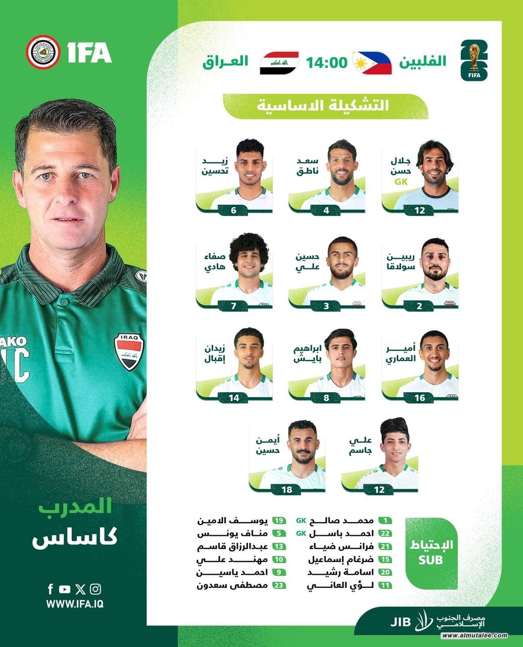 أعلن الاتحاد العراقي لكرة القدم ،اليوم الثلاثاء، التشكيلة الاساسية لمنتخبنا الوطني خلال مواجهته نظيره الفلبيني ضمن تصفيات كأس العالم 2026 وكأس اسيا 2027.