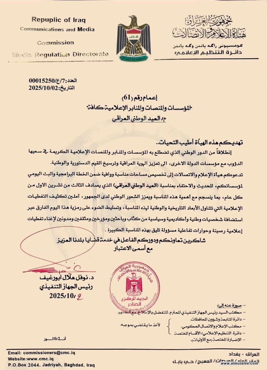 دعت هيئة الإعلام والاتصالات، اليوم الخميس، جميع المؤسسات الإعلامية العاملة في العراق إلى تكثيف برامجها الوطنية والاحتفالية بالتزامن مع حلول الذكرى السنوية للعيد الوطني العراقي.
