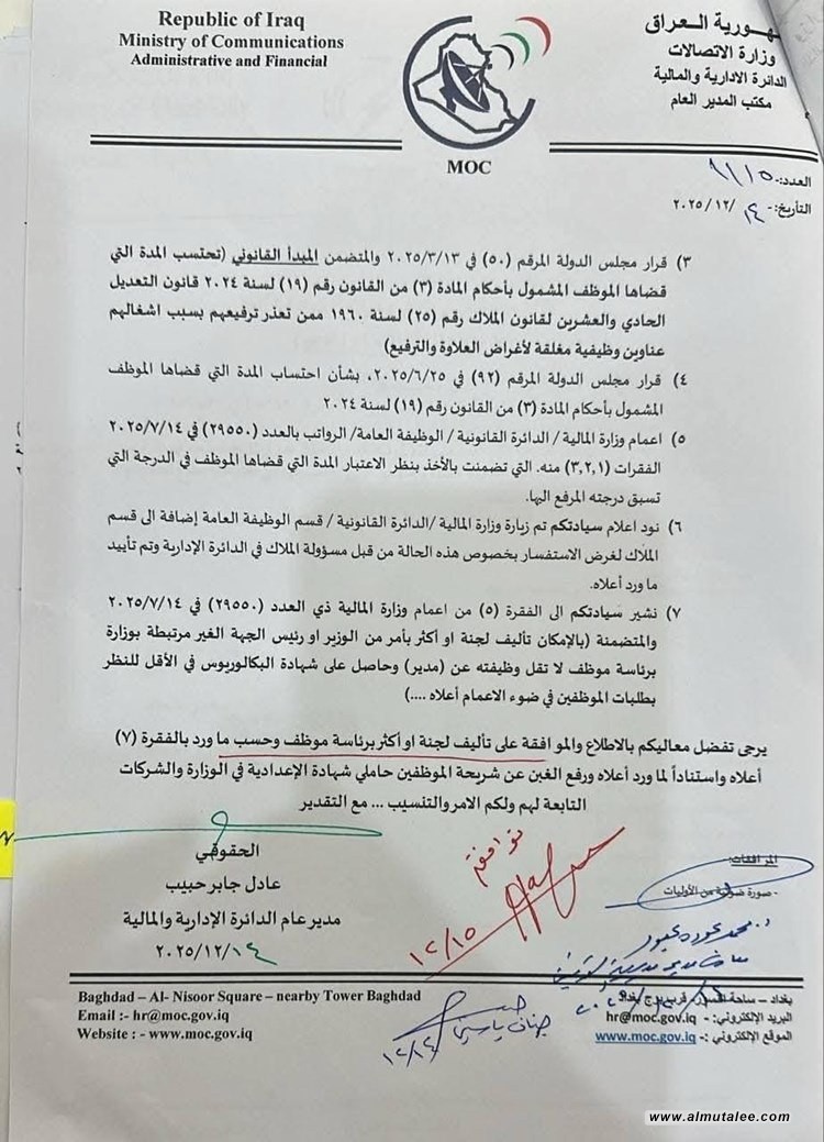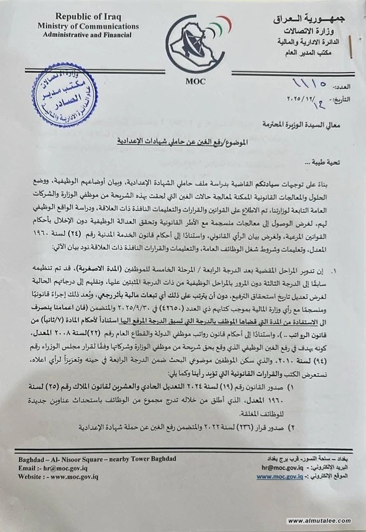 أعلنت وزارة الاتصالات، اليوم الاثنين، عن موافقتها على معالجة ملف موظفيها حاملي الشهادة الإعدادية في الوزارة والشركات العامة التابعة لها، بما يرفع الغبن الوظيفي الذي تعرضت له هذه الشريحة.