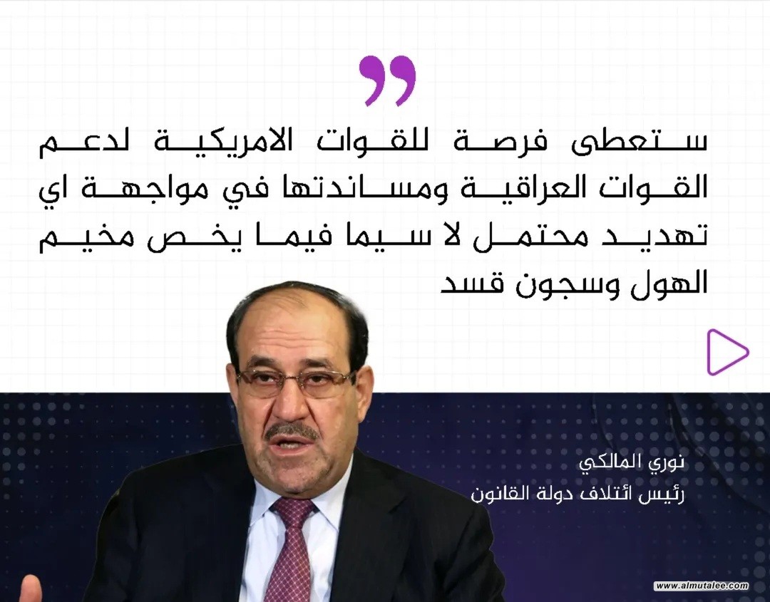 كشف رئيس ائتلاف دولة القانون نوري المالكي عن:"وجود تريث في تنفيذ موعد انسحاب القوات الأمريكية من الأراضي العراقية، والذي كان من المقرر أن يتم في موعد أقصاه سبتمبر 2025، وذلك بسبب التطورات الأمنية الإقليمية، لاسيما في سوريا".