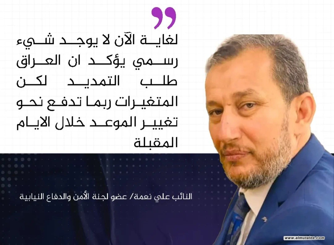 وفي هذا السياق، أكد النائب علي نعمة، عضو لجنة الأمن والدفاع النيابية، أنه:"حتى الآن، لا يوجد طلب رسمي من الحكومة العراقية لتمديد بقاء القوات الأمريكية، إلا أن المتغيرات الإقليمية قد تؤدي إلى تغيير الموعد خلال الأيام المقبلة".