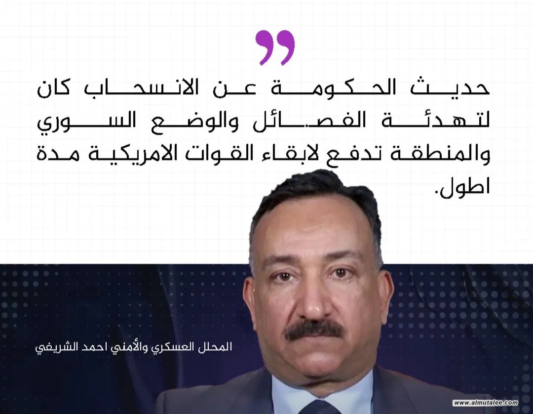 ومن جانبه، رأى المحلل الأمني والعسكري أحمد الشريفي أن:"تصريحات الحكومة حول الانسحاب الأميركي كانت تهدف لتهدئة الفصائل، مضيفاً أن الوضع المتأزم في سوريا قد يدفع لبقاء القوات الأمريكية فترة أطول مما كان مخططاً له".