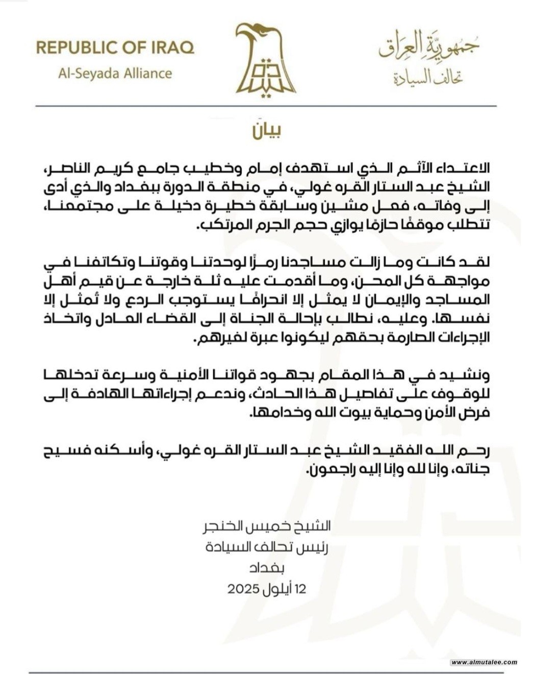 ادان رئيس تحالف السيادة خميس الخنجر، اليوم الجمعة، حادثة اغتيال إمام وخطيب جامع كريم الناصر الشيخ عبد الستار القره غولي في منطقة الدورة ببغداد، واصفاً الاعتداء بأنه فعل مشين وسابقة خطيرة تستوجب موقفاً حازماً، مؤكداً ضرورة إحالة الجناة إلى القضاء العادل واتخاذ إجراءات صارمة بحقهم، مع الإشادة بجهود القوات الأمنية في متابعة تفاصيل الحادث.