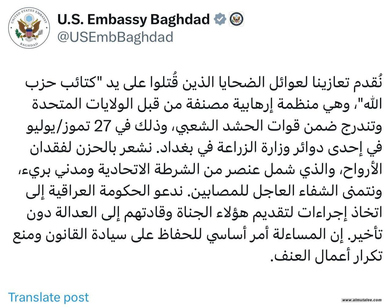 السفارة الأميركية: "كتائب حزب الله" مسؤولة عن هجوم دائرة الزراعة ببغداد