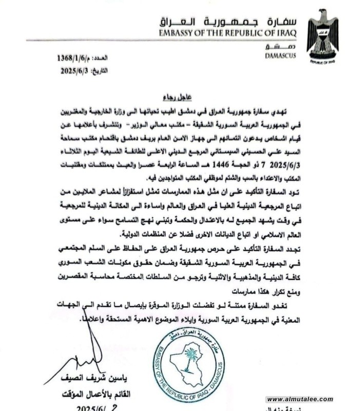 أعربت السفارة العراقية في دمشق اليوم الجمعة، عن استيائها البالغ إزاء حادثة اقتحام مكتب المرجع الديني السيد علي السيستاني، في دمشق يوم الثلاثاء الماضي.