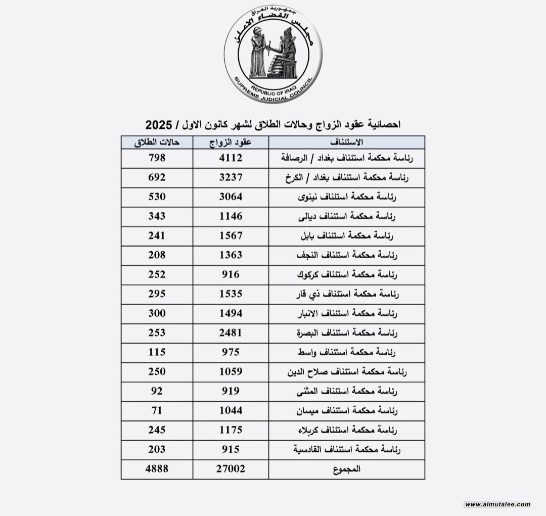 اعلن مجلس القضاء الأعلى، اليوم الإثنين، عن "27002" عقد زواج و"4888" حالة طلاق خلال شهر كانون الأول الماضي.