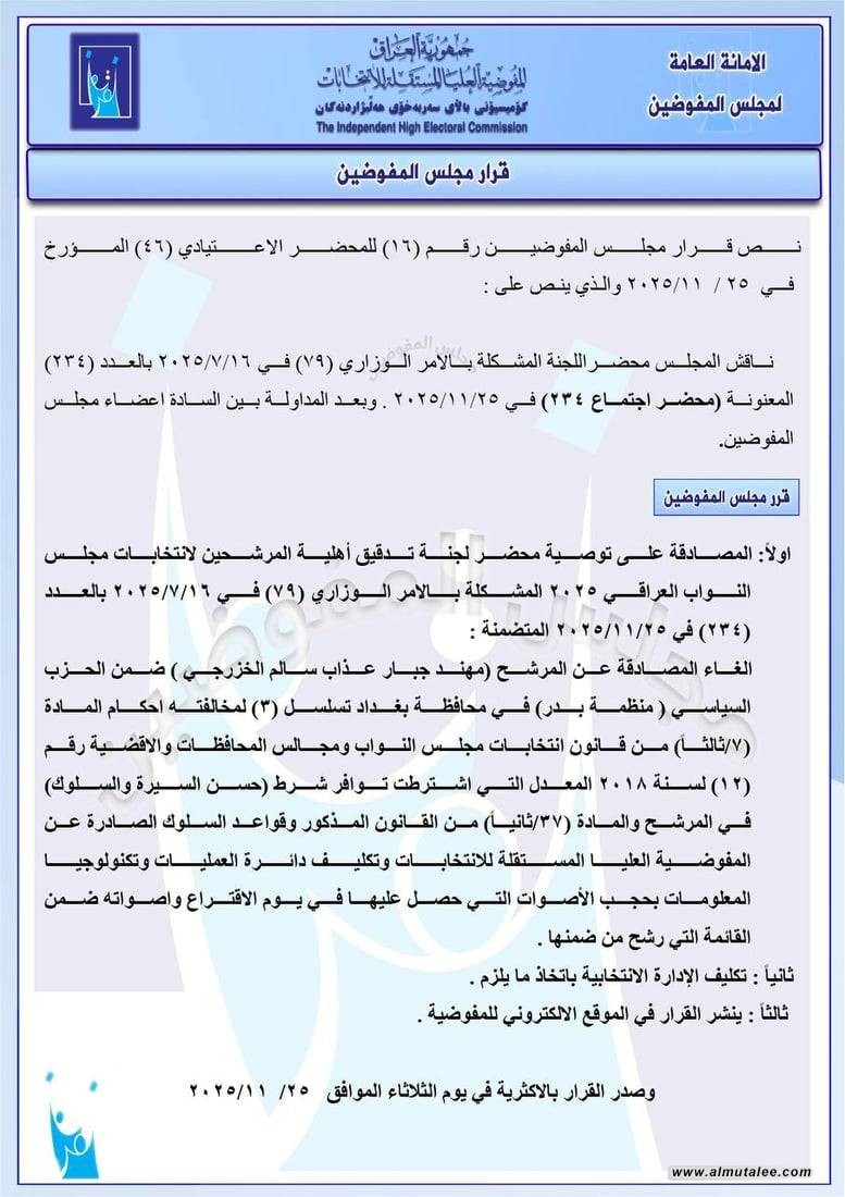 وفي تطور حاسم، أعلنت مفوضية الانتخابات العراقية إلغاء مصادقة المرشح الفائز "مهند جبار الخزرجي" عن محافظة بغداد، بعد تأكدها من مخالفته شرط "حسن السيرة والسلوك"، وهو شرط أساسي لنيل عضوية البرلمان.