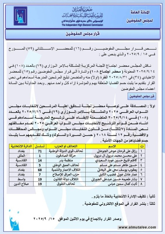 أقر مجلس المفوضين في المفوضية العليا المستقلة للانتخابات بحسب وثيقة، مؤرخة الاثنين، توصية اللجنة المركزية المشكلة بالأمر الوزاري، بشأن المصادقة على أهلية ثمانية مرشحين لانتخابات مجلس النواب المقبلة، بعد استكمال التدقيق الأمني والإداري الخاص بسيرهم وملفاتهم.