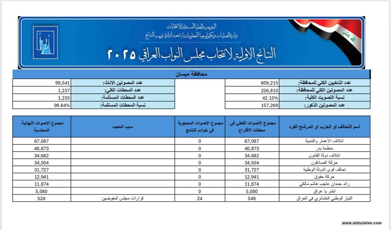 "المطلع" تنشر النتائج الأولية للانتخابات النيابية في محافظة ميسان