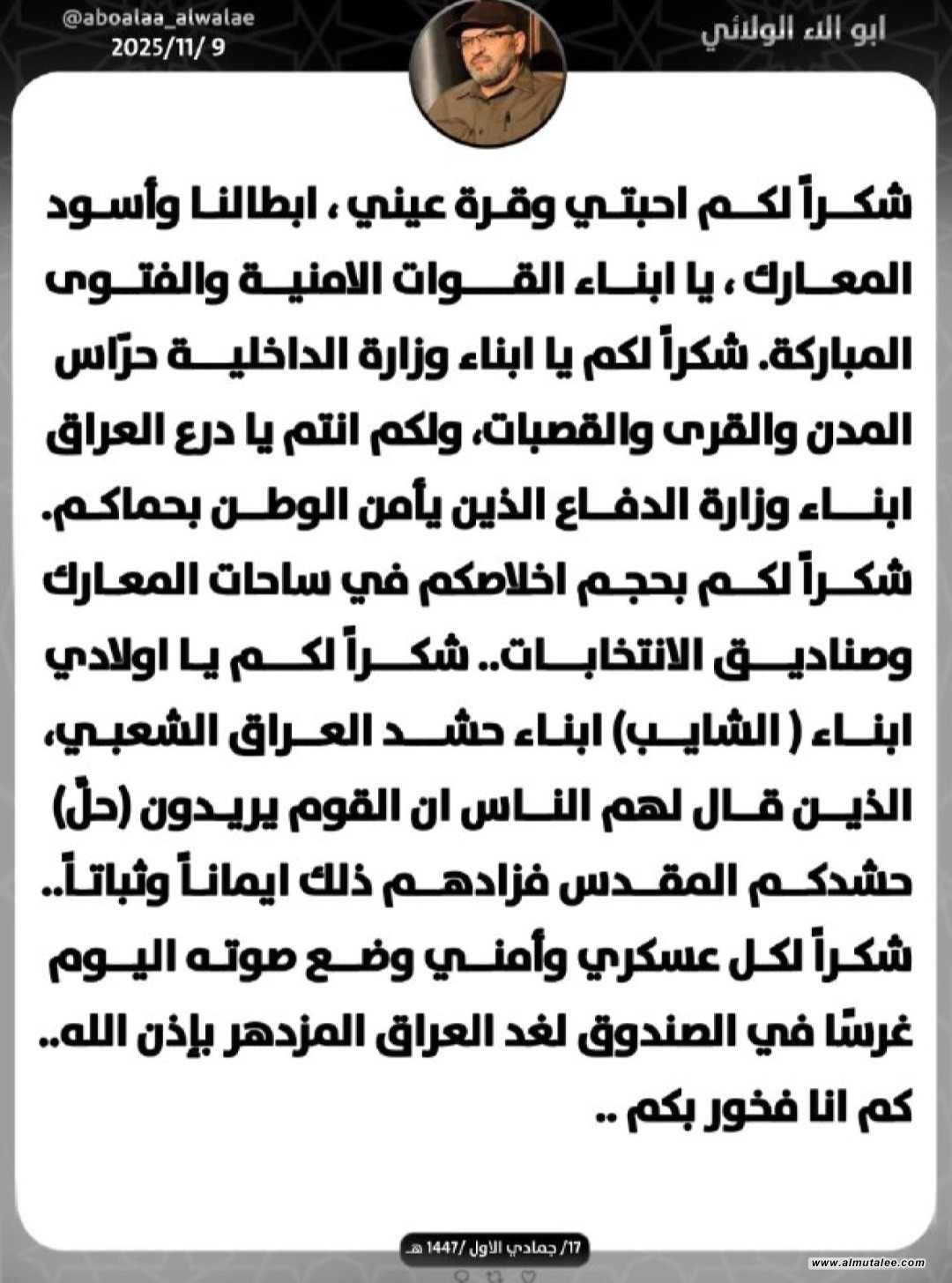 وقال الولائي في تدوينة تابعتها "المطلع"، "شكراً لكم أحبتي وقرة عيني أبطالنا وأسود المعارك يا أبناء القوات الأمنية والفتوى المباركة. شكراً لكم يا أبناء وزارة الداخلية حرّاس المدن والقرى والقصبات، ولكم أنتم يا درع العراق أبناء وزارة الدفاع الذين يأمن الوطن بحماكم".