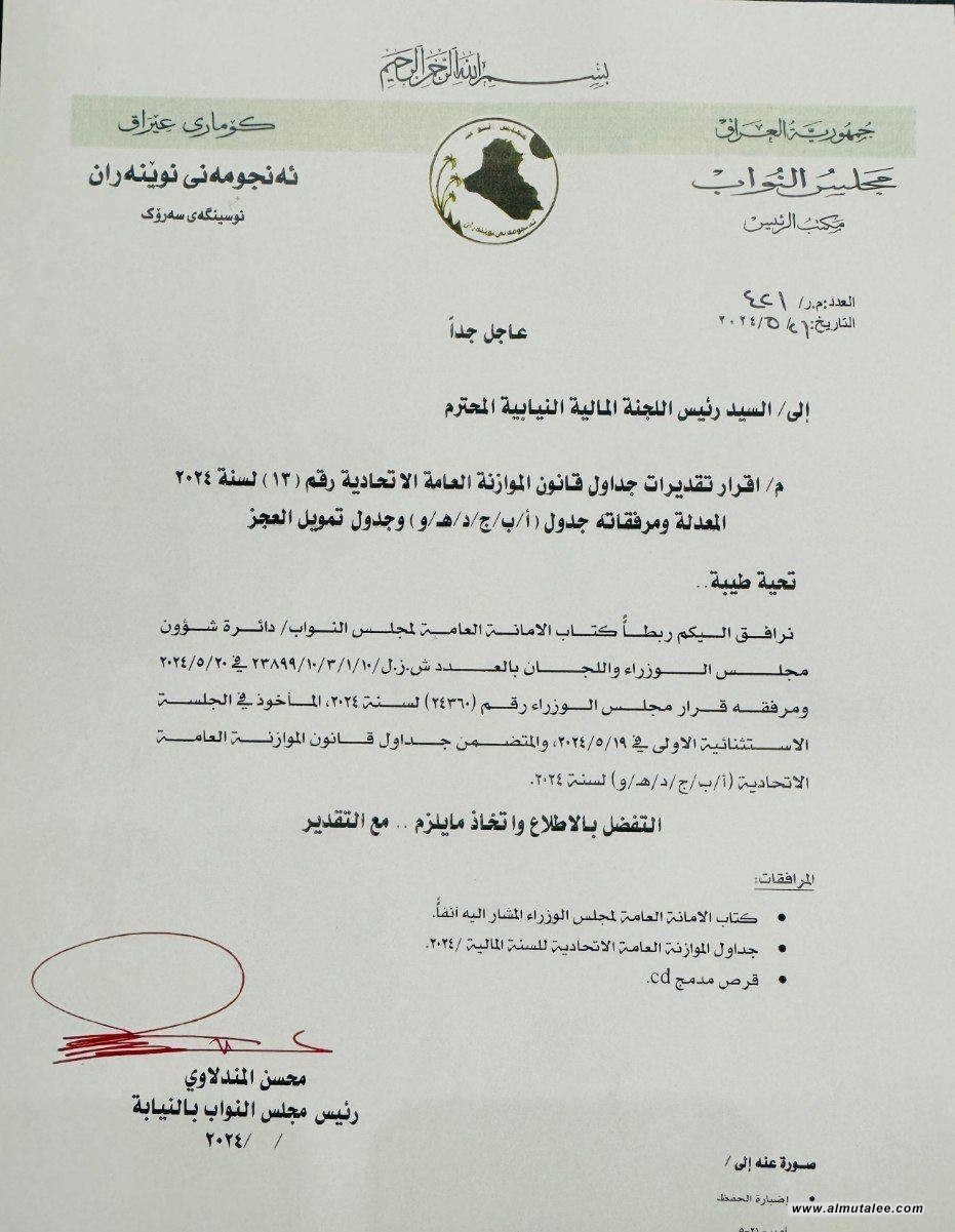 احال رئيس مجلس النواب بالنيابة "محسن المندلاوي"، جداول قانون الموازنة العامة الاتحادية 2024 إلى اللجنة المالية النيابية.
