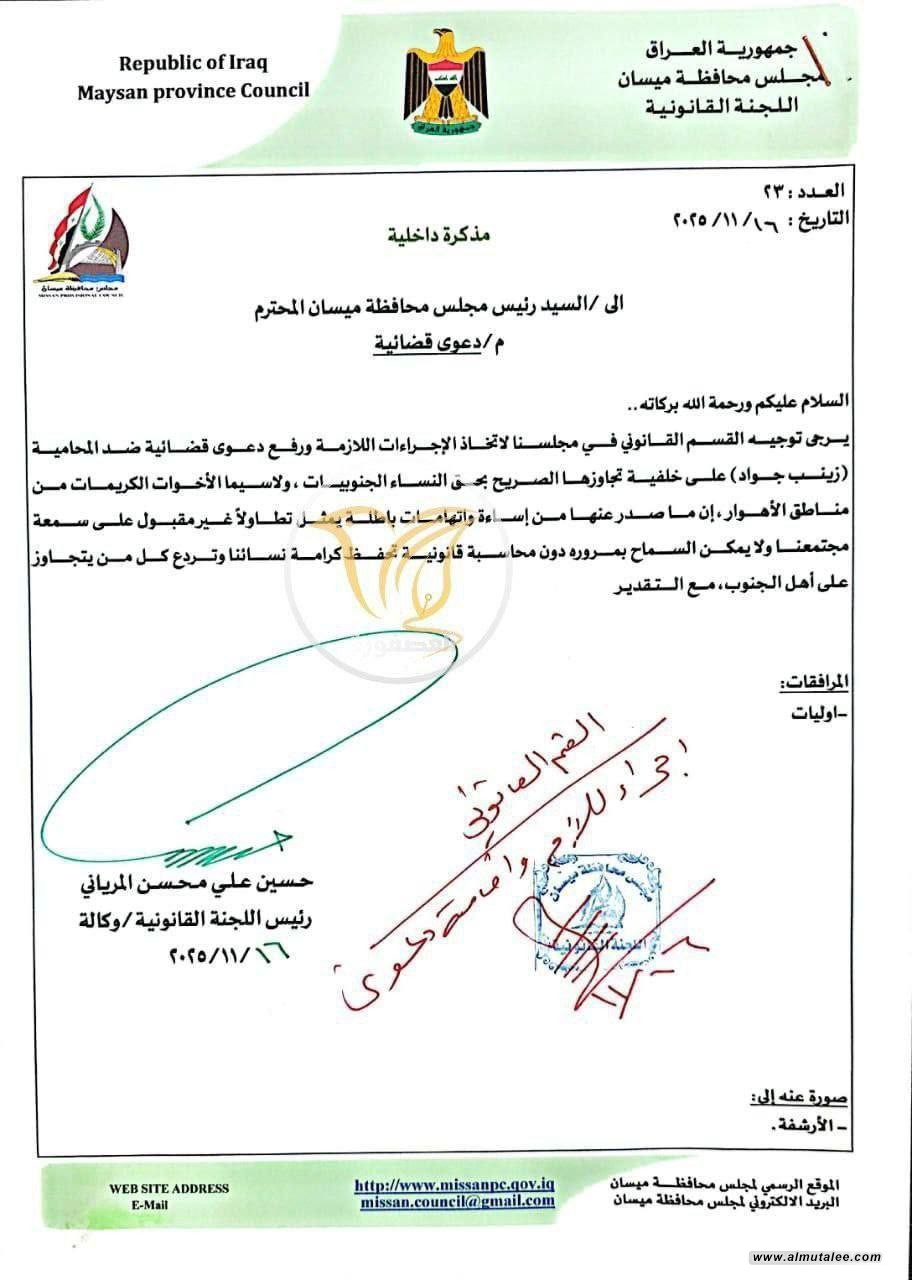 رفع عضو مجلس محافظة ميسان حسين المرياني ،اليوم الأحد، دعوى قضائية ضد المحامية زينب جواد، وذلك على خلفية ما وصفه بـ"الإساءة الموجهة إلى نساء الأهوار".
