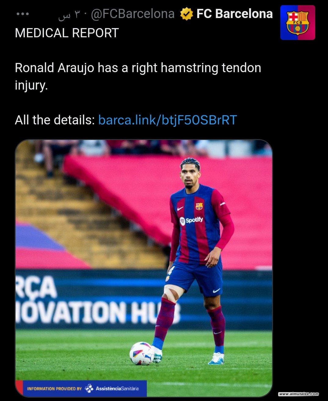 وأشار النادي إلى أن "الفحوصات الطبية تُظهر إصابة رونالد أراوخو في وتر العضلات الخلفية للفخذ الأيمن"، مضيفاً أنه "سيخضع لجراحة يقودها الدكتور لاسي ليمبينن، ويشرف عليها الطاقم الطبي للنادي، في فنلندا".