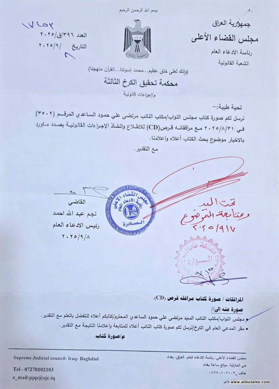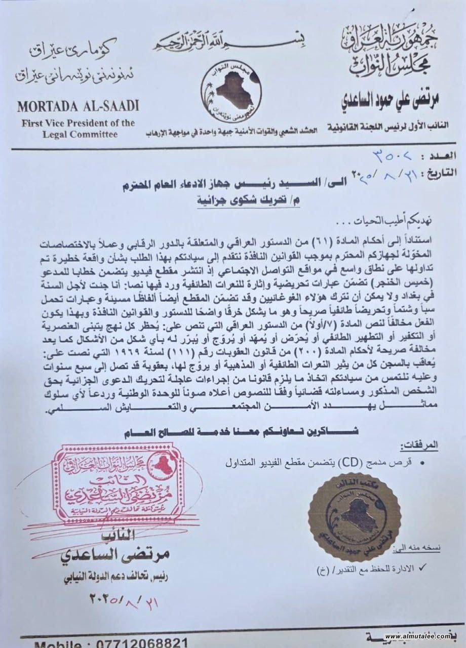 وجه جهاز الادعاء العام في العراق ،اليوم الخميس محكمة تحقيق الكرخ الثالثة باتخاذ كافة الإجراءات القانونية بحق خميس الخنجر إثر شكوى قضائية تقدم بها النائب مرتضى الساعدي، بعد تداول مقطع فيديو يتضمن تصريحات وُصفت بالتحريضية والطائفية، وردت فيها عبارات مثل: "جئت لأجل السنة في بغداد" و"لا يمكن أن نترك هؤلاء الغوغائيين"، إضافة إلى ألفاظ سب وشتم وتحريض طائفي.