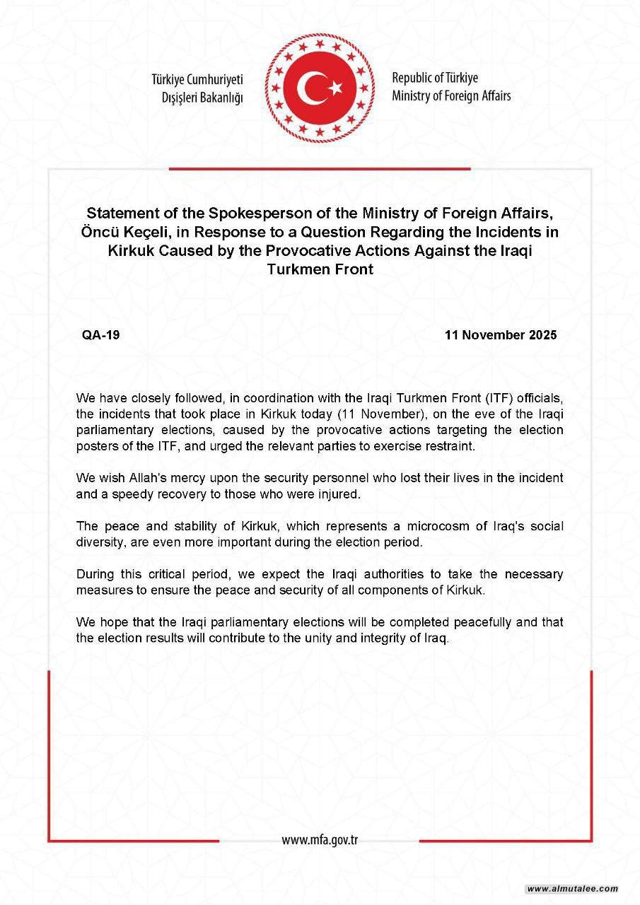 وأعربت الخارجية التركية في بيانها، عن استنكارها الشديد للحادثة، مؤكدة أنها تتابع التطورات عن كثب، وداعية إلى منع تكرار مثل هذه الأفعال التي وصفتها بأنها "تمس بحقوق التركمان في المشاركة السياسية".
