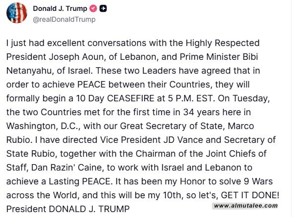 ترامب يعلن التوصل لاتفاق لوقف النار بين إسرائيل ولبنان لمدة 10 أيام