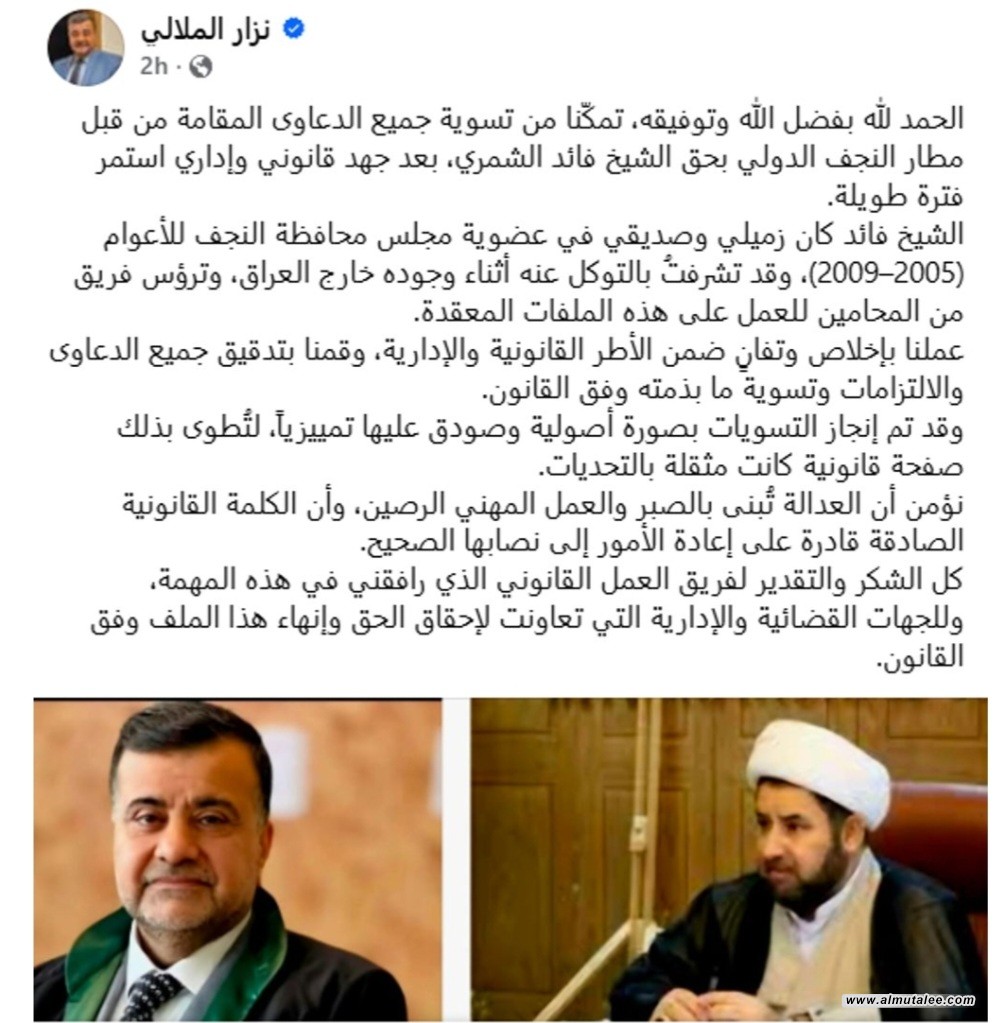 وقال الملالي في منشور عبر صفحته على فيسبوك تابعته المطلع، إنه:"تمكّنا من تسوية جميع الدعاوى المقامة من قبل مطار النجف الدولي بحق الشيخ فائد الشمري، بعد جهد قانوني وإداري استمر فترة طويلة. قمنا بتدقيق جميع الالتزامات وتسوية ما بذمته وفق القانون، وقد تم إنجاز التسويات بصورة أصولية وصودق عليها تمييزياً".