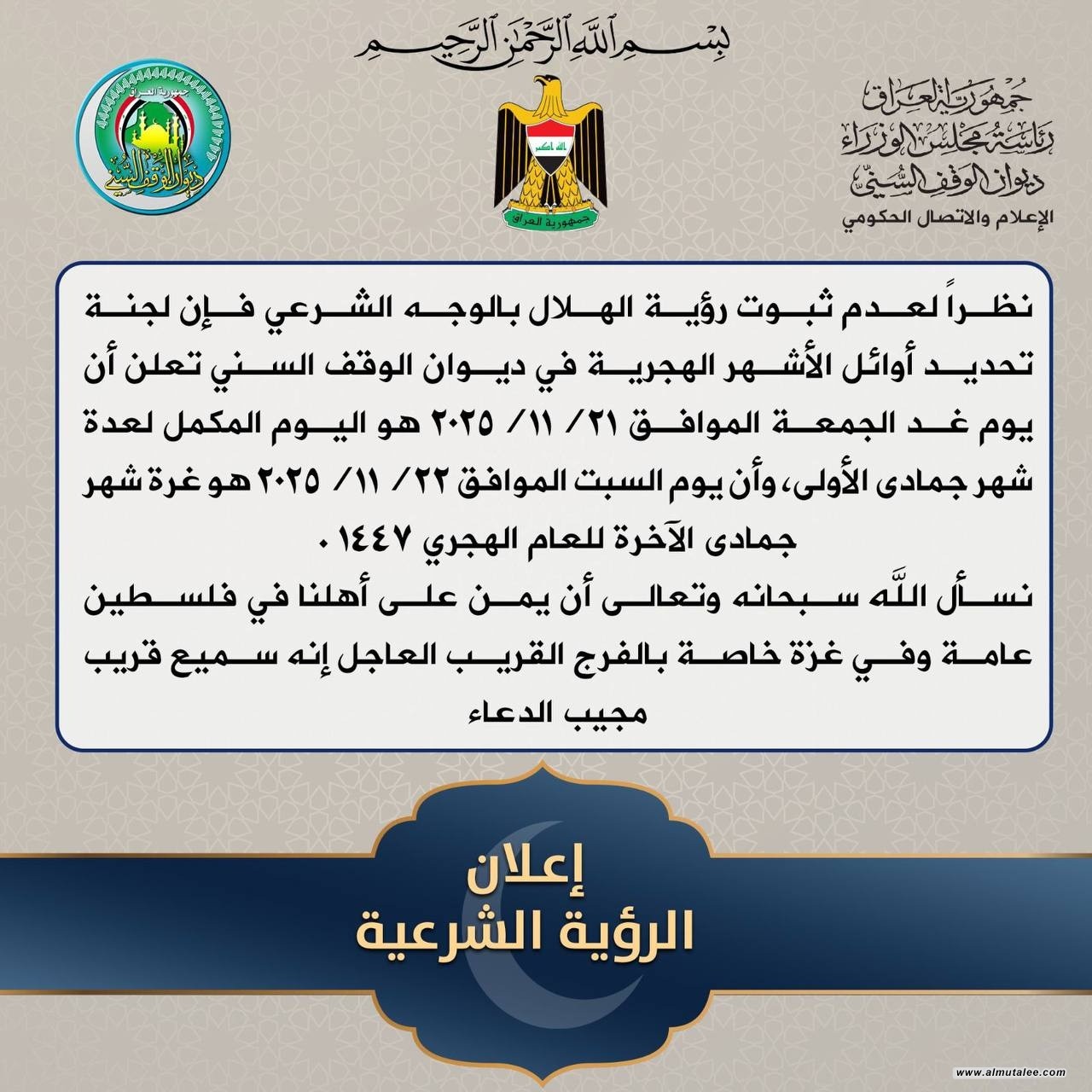 أعلن ديوان الوقف السني، مساء اليوم الخميس، أن ،يوم السبت المقبل، هو غرة شهر جمادى الاخرة للعام الهجري 1447.