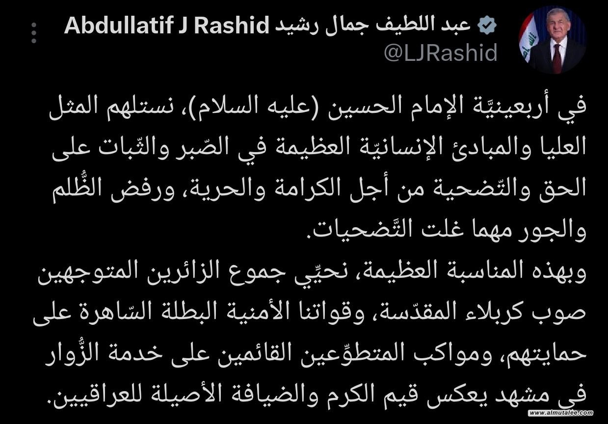 وقال رشيد في تدوينة على منصة اكس وتابعتها "المطلع"، انه: بهذه المناسبة العظيمة نحيِّي جموع الزائرين المتوجهين صوب كربلاء المقدّسة، وقواتنا الأمنية البطلة السّاهرة على حمايتهم، ومواكب المتطوِّعين القائمين على خدمة الزُّوار في مشهد يعكس قيم الكرم والضيافة الأصيلة للعراقيين".
