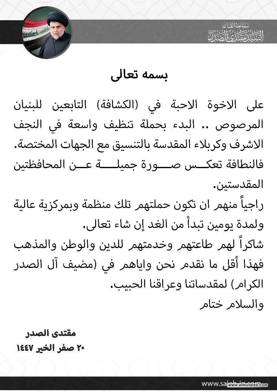 سەدر لە پۆستێکدا لەسەر پلاتفۆرمی (X)، کەموتەڵع بەدواداچوونی بۆ کردووە، نووسیویەتی: " دەبێت برا خۆشەویستەکانی ناو (دێدەوانی)ی سەر بە بونیانی مەڕسووس، هەڵمەتێکی پاککردنەوەی بەرفراوان لە شاری پیرۆزی نەجەف و شاری پیرۆزی کەربەلا بە هەماهەنگی لەگەڵ لایەنە پەیوەندیدارەکان دەستپێبکەن، بەو پێیەی پاکوخاوێنی وێنەیەکی جوانی لەهەردوو پارێزگای پیرۆز ڕەنگدەداتەوە".