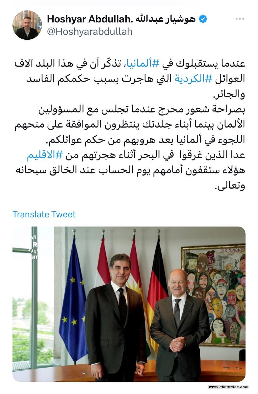 و قال عبدالله في تغريدة تابعتها المطلع:"عندما يستقبلوك في ألمانیا، تذكّر أن في هذا البلد آلاف العوائل الكردية التي هاجرت بسبب حکمکم الفاسد والجائر.