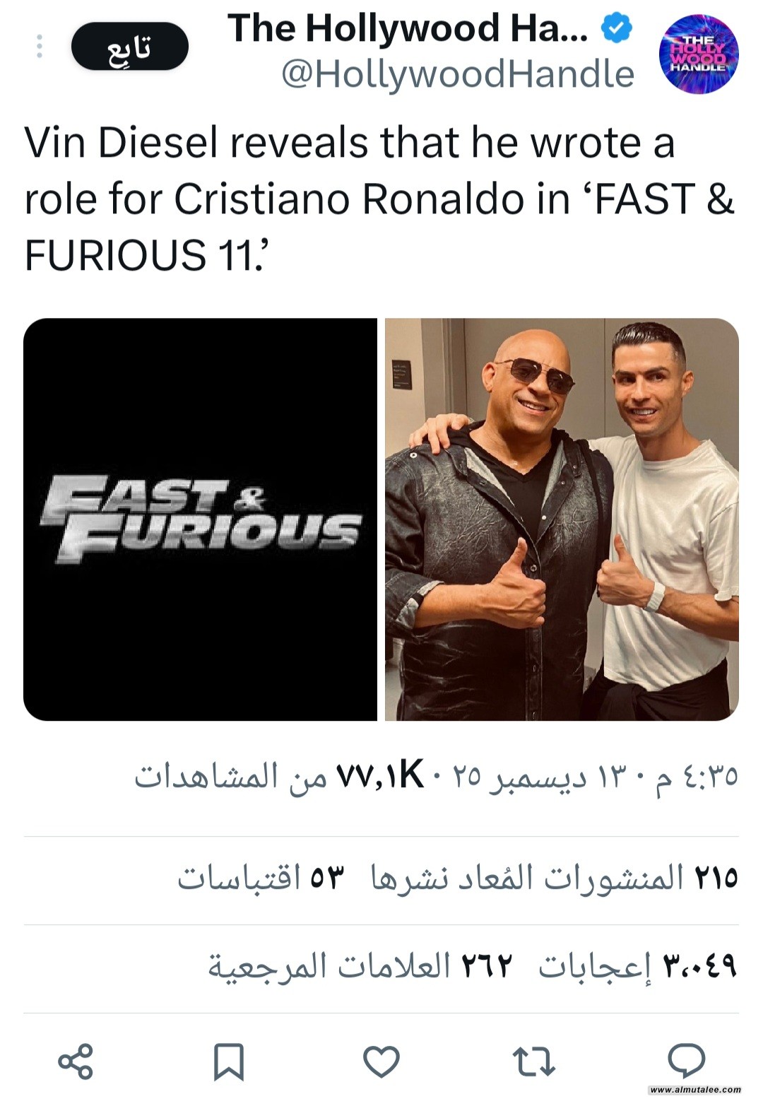 أثار الممثل الأميركي الشهير فين ديزل ضجة كبيرة على السوشيال ميديا، بعد مشاركة صورة تجمعه مع كريستيانو رونالدو، ألمح فيها بقوة إلى ظهور لاعب النصر السعودي في فيلم FAST & FURIOUS 11.