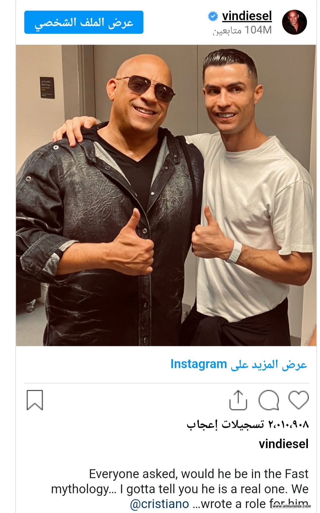 ديزل شارك في الساعات الماضية عبر حسابه الخاص على إنستغرام، صورةً تجمعه مع رونالدو، معلقاً بما معناه : "الجميع تساءل هل سيكون جزءًا من عالم السرعة والغضب؟ عليّ أن أؤكد لكم أنه شخصية حقيقية. لقد كتبنا له دورًا خاصًا".