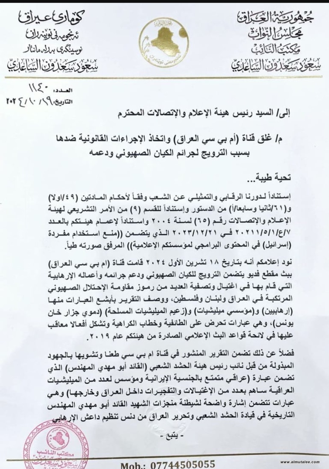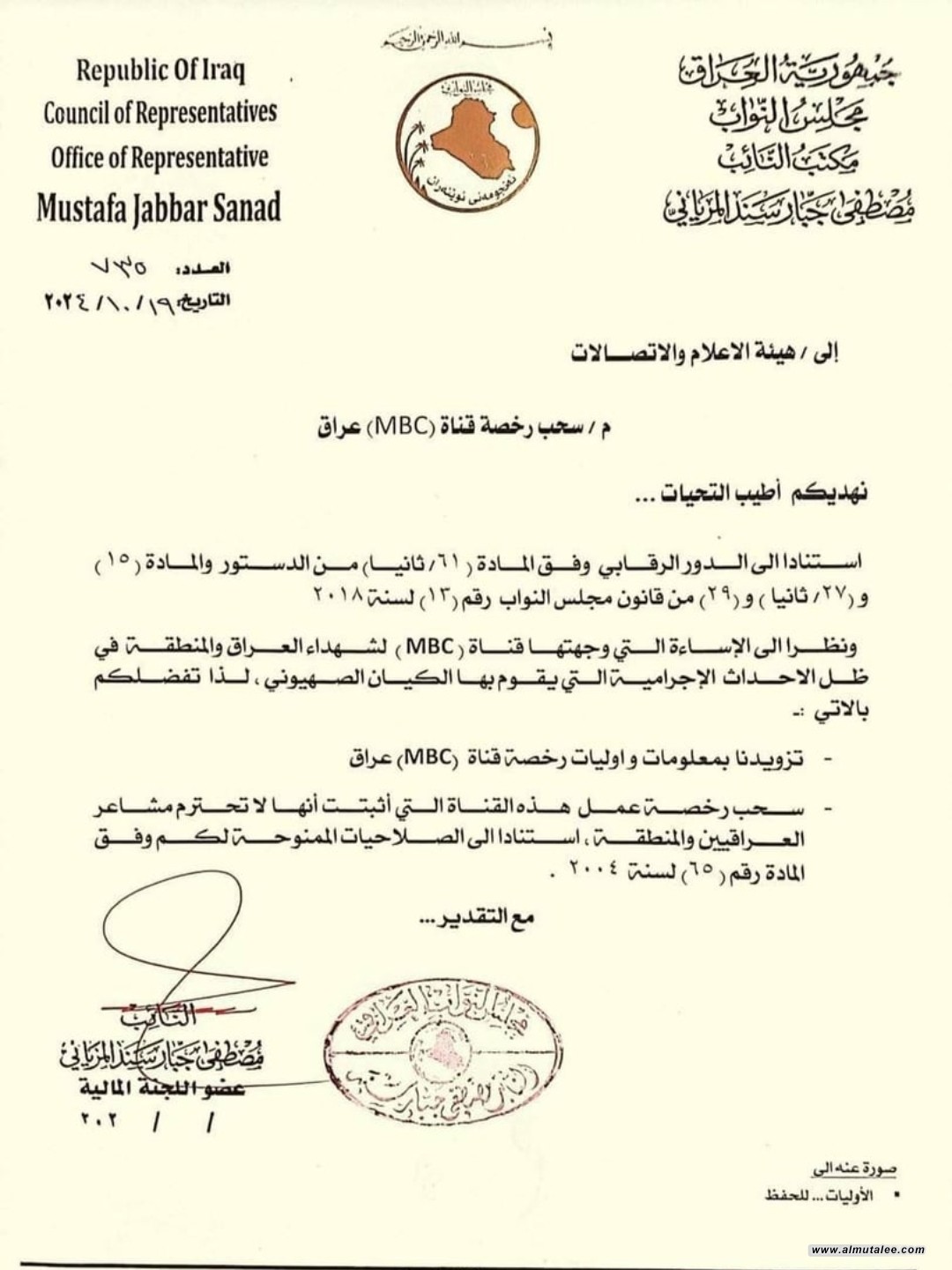 لإساءتهم للشهداء... برلمانيون يطلبون سحب رخصة ام بي سي العراق(وثائق)