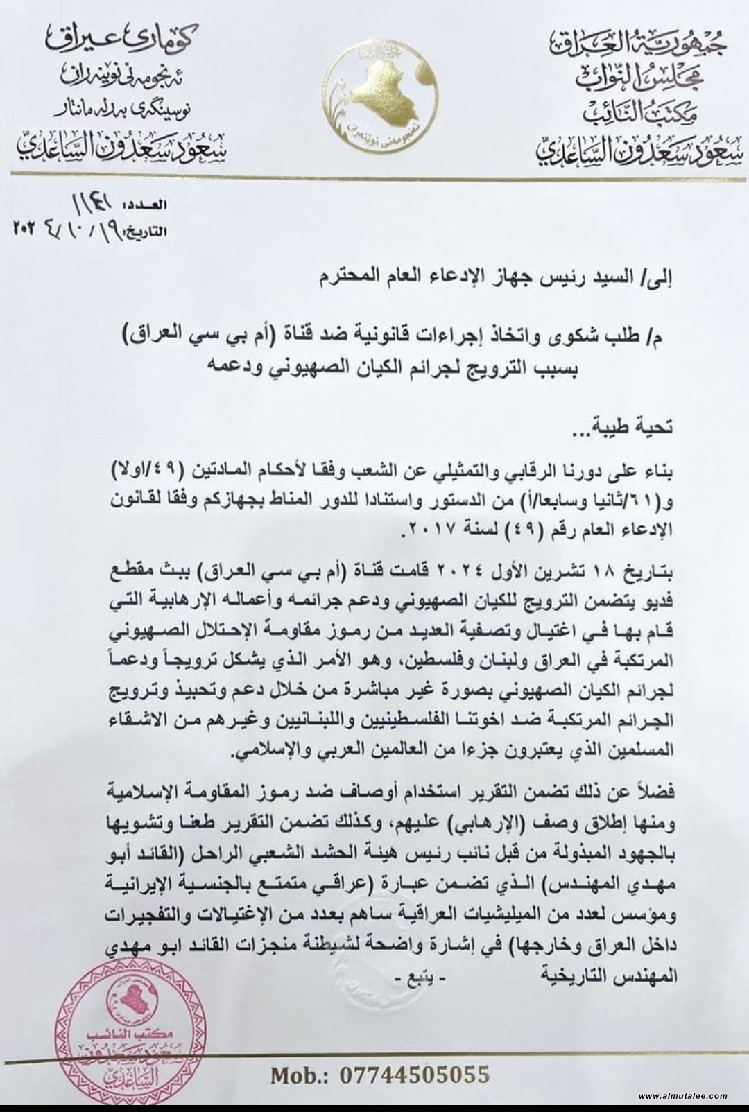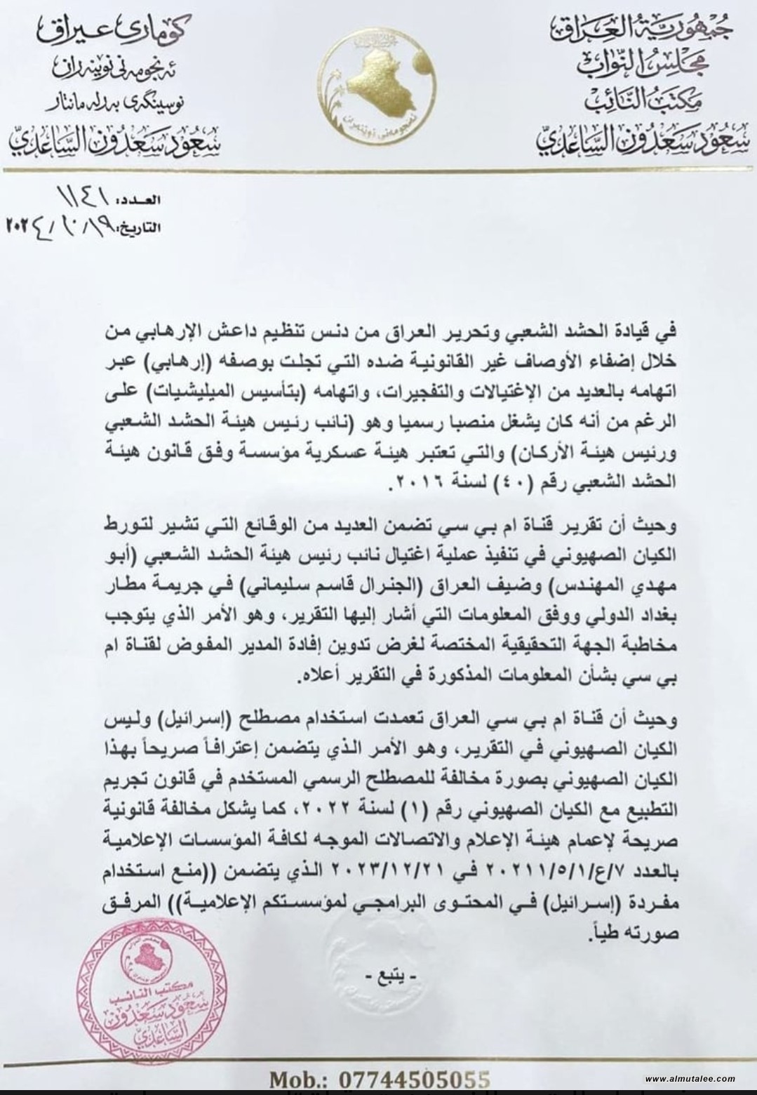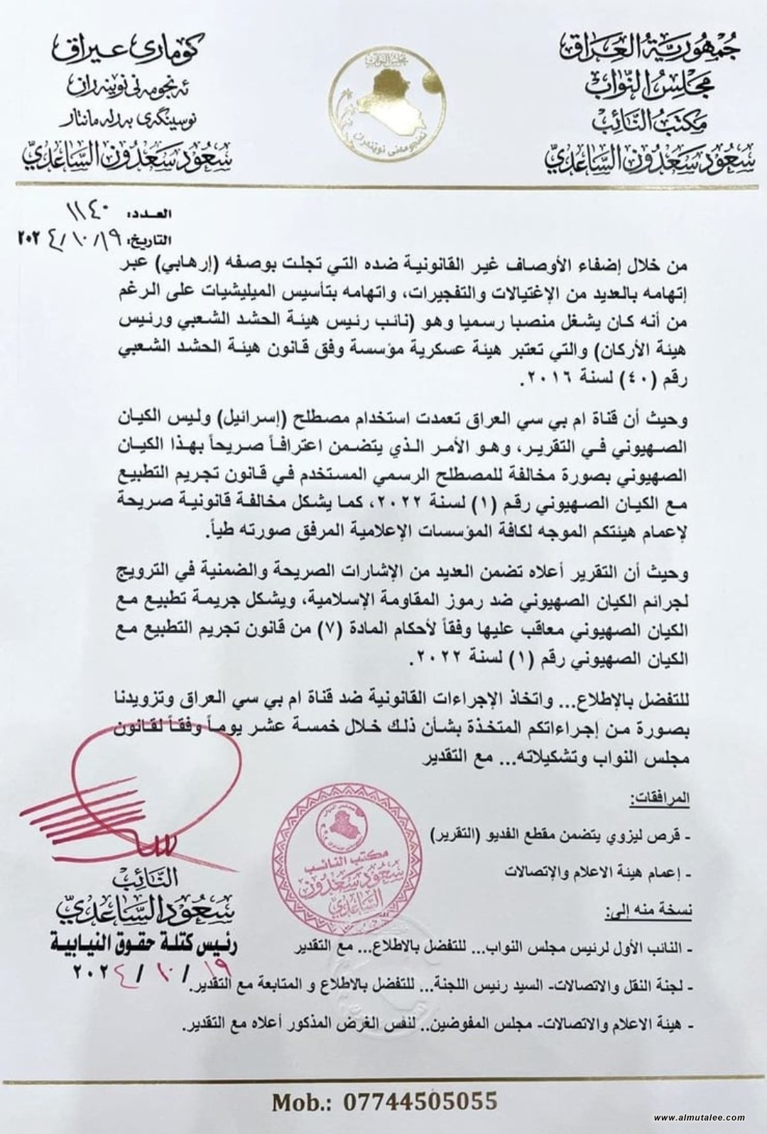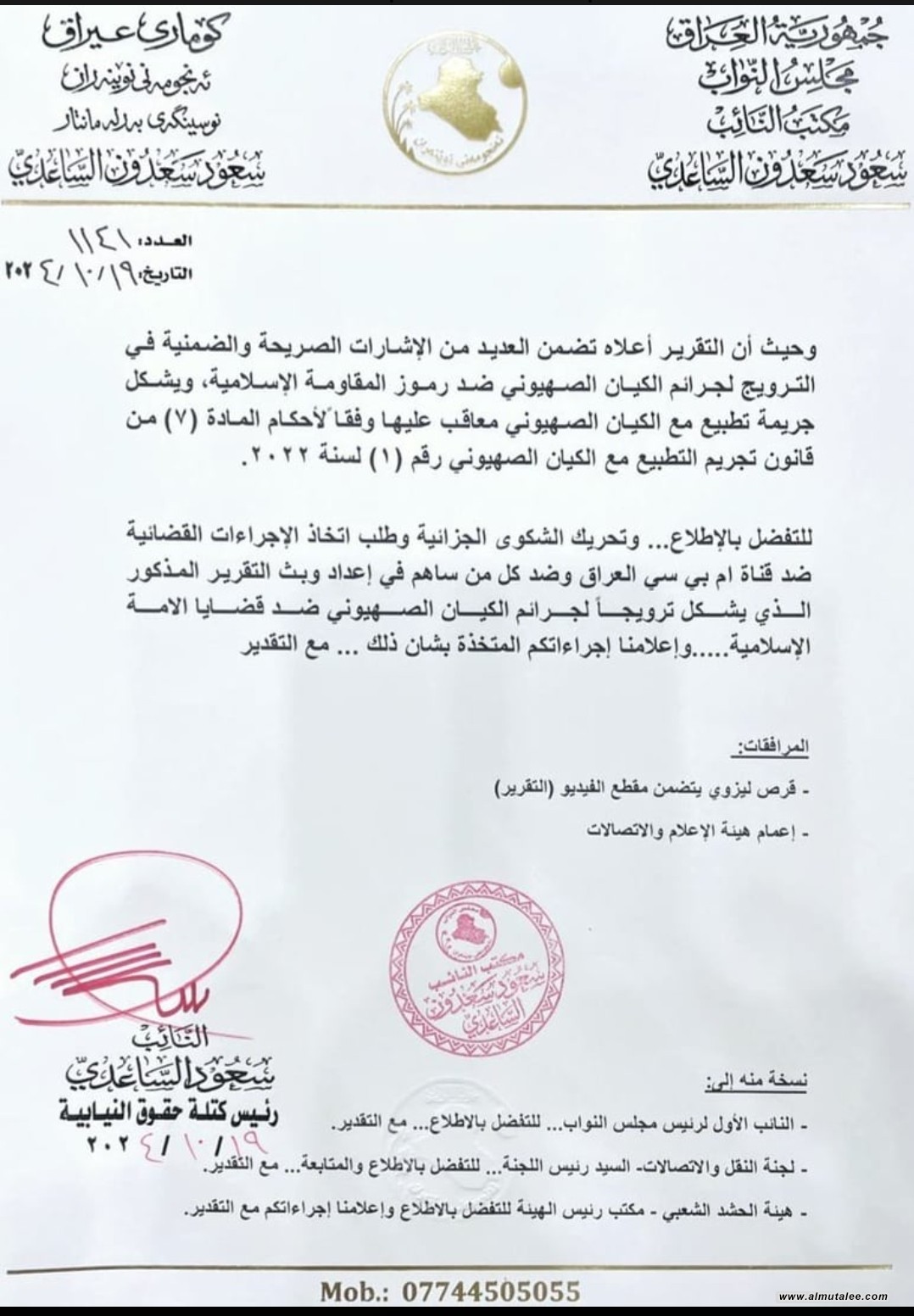 كما طالب النائب سعود الساعدي، من رئيس جهاز الإدعاء العام وهيئة الإعلام، باتخاذ إجراءات قانونية ضد القناة، لأنها تروّج لجرائم الكيان الصهيوني وفق تعبيره.