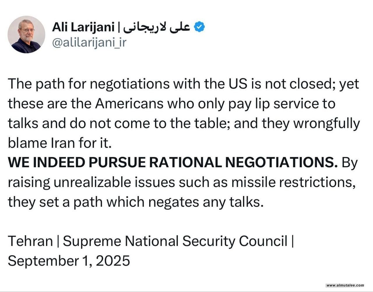 سێشەممە 2ی ئەیلوولی 2025، عەلی لاریجانی، ئەمینداری ئەنجوومەنی باڵای ئاسایشی نیشتمانیی ئێران لە تۆڕی کۆمەڵایەتیی (ئێکس) نووسیویەتی: ڕێگای دانوستانمان لەگەڵ ئەمەریکا دانەخستووە، بەڵکوو ئەوە ئەمەریکایە کە نایەوێت دانوستان بکات و ڕەخنەش لە ئێمە دەگرێت.